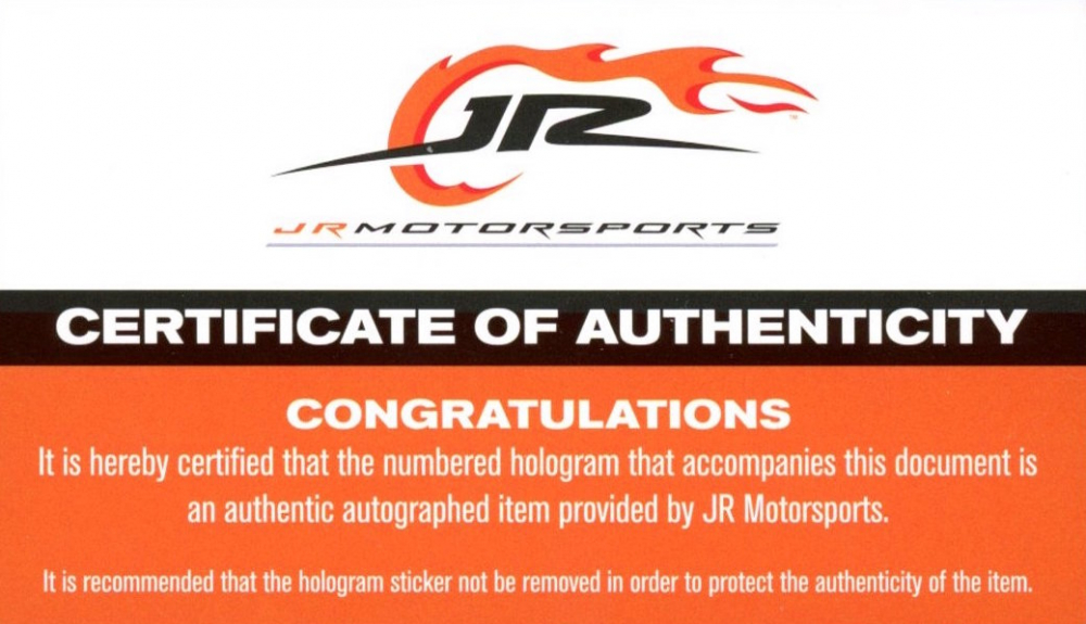 The autograph includes an official Dale Earnhardt Jr. hologram and COA from JR Motorsports for authenticity purposes. Also includes a Pristine Authentic tamper proof hologram and matching COA.