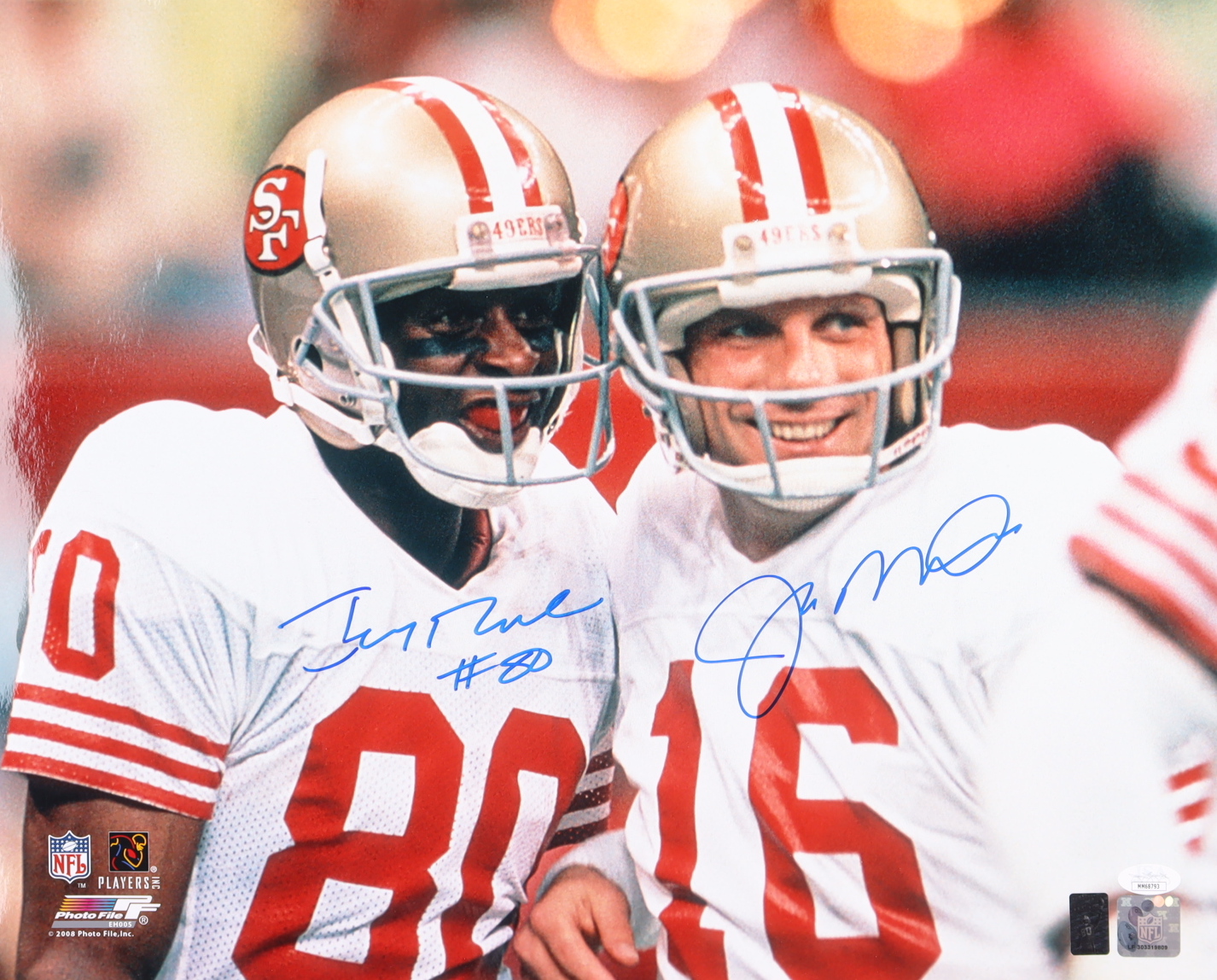 The lot / autograph(s) includes an official James Spence Authentication (JSA) hologram and matching COA as well as an official Jerry Rice hologram for authenticity purposes.