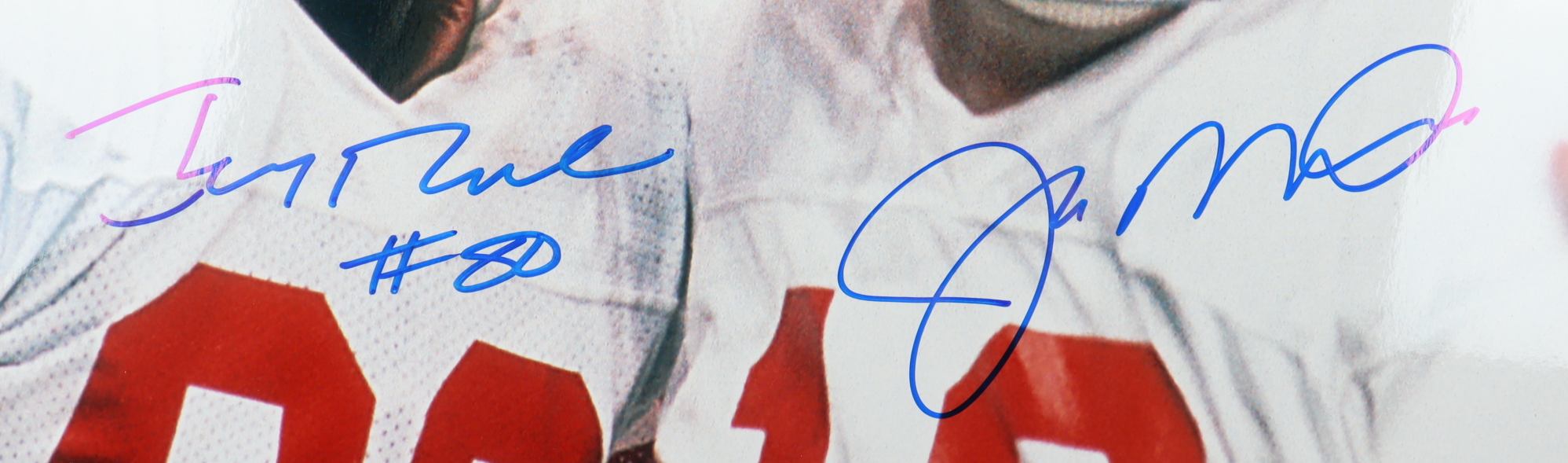 Photo measures 16" x 20" in size and has been hand-signed by Joe Montana (San Francisco 49ers, HOF) and Jerry Rice (San Francisco 49ers, HOF).