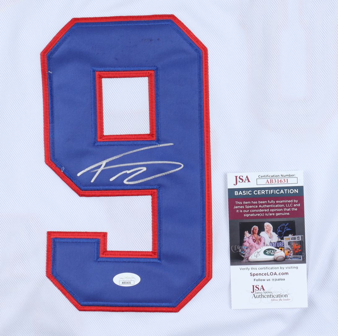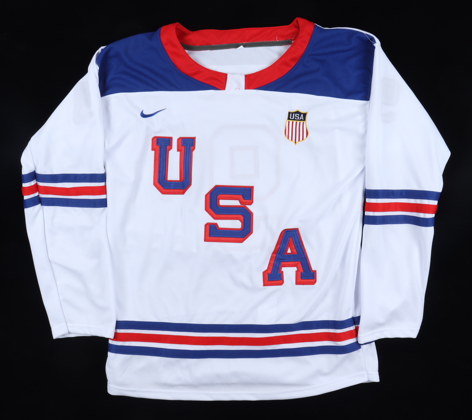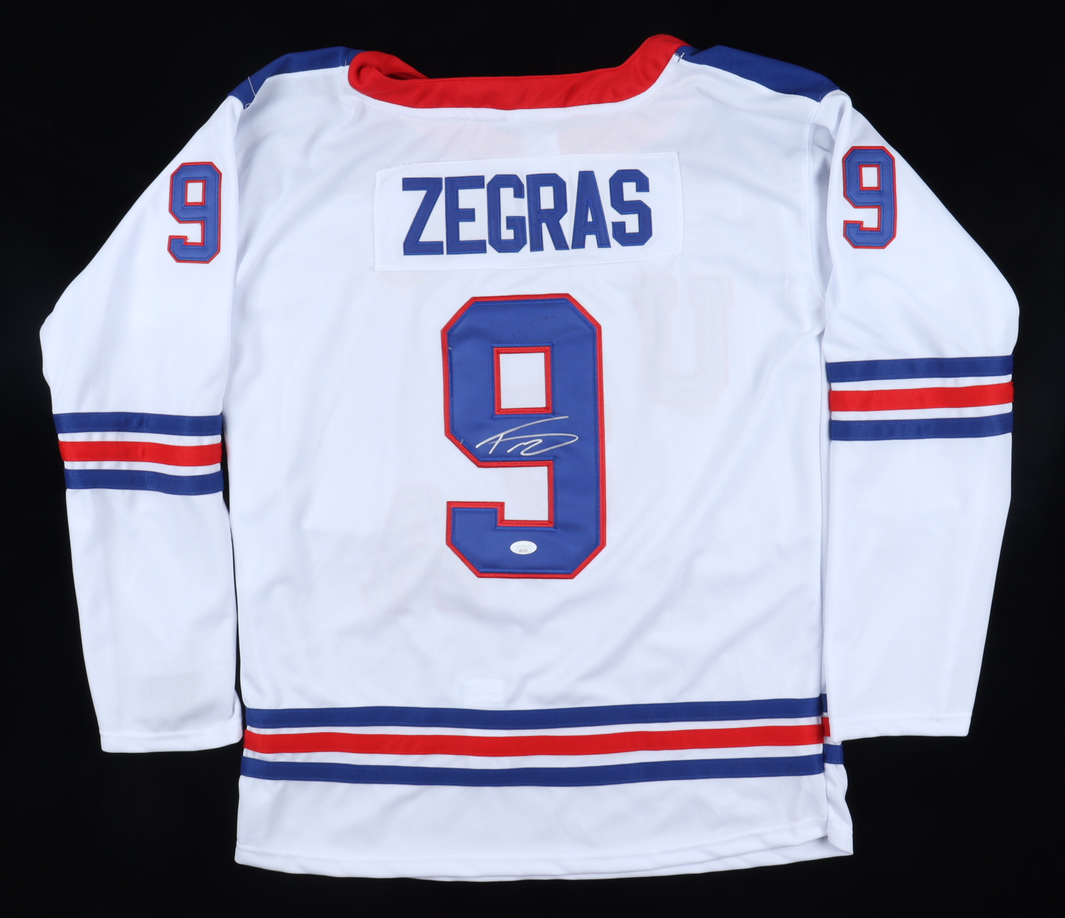 On-ice style jersey. Everything is sewn on, size XL. Hand-signed by Trevor Zegras.