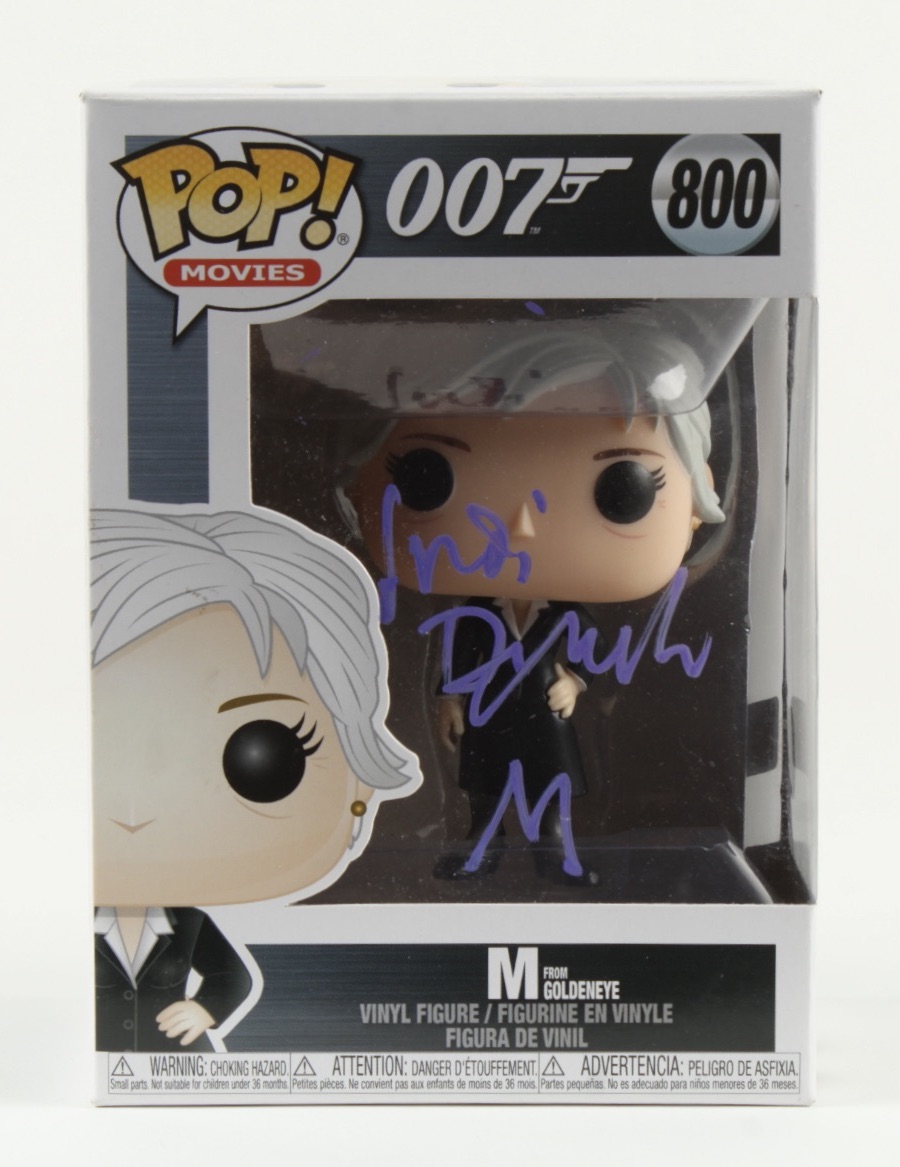 Funko Pop! Vinyl Figure measures approximately 4" in height. Packaging has been hand-signed and inscribed by Judi Dench (M).
