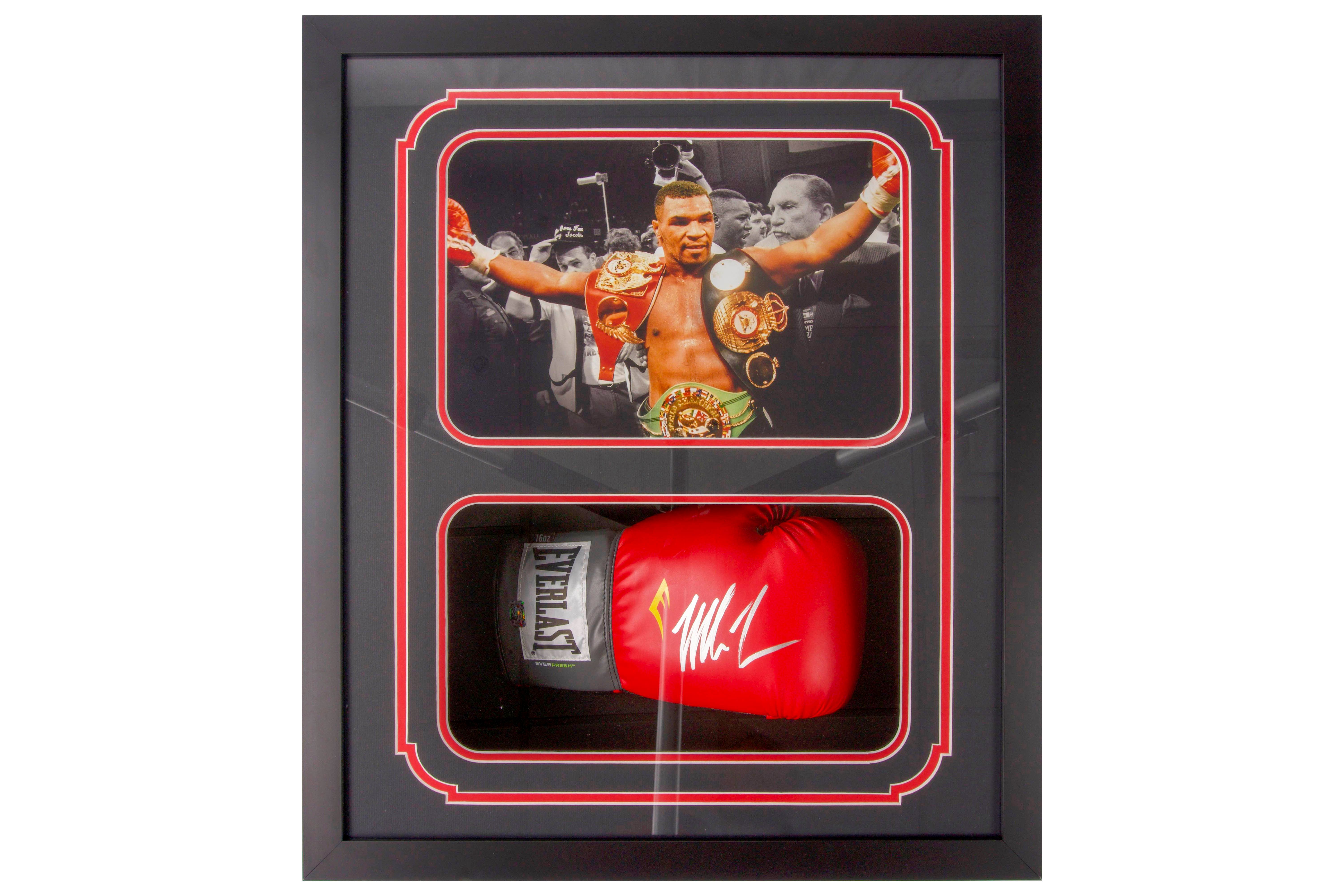 Custom framed shadowbox measures 22" x 24" in size and features an Everlast Boxing glove that has been hand-signed by Mike Tyson (HOF).