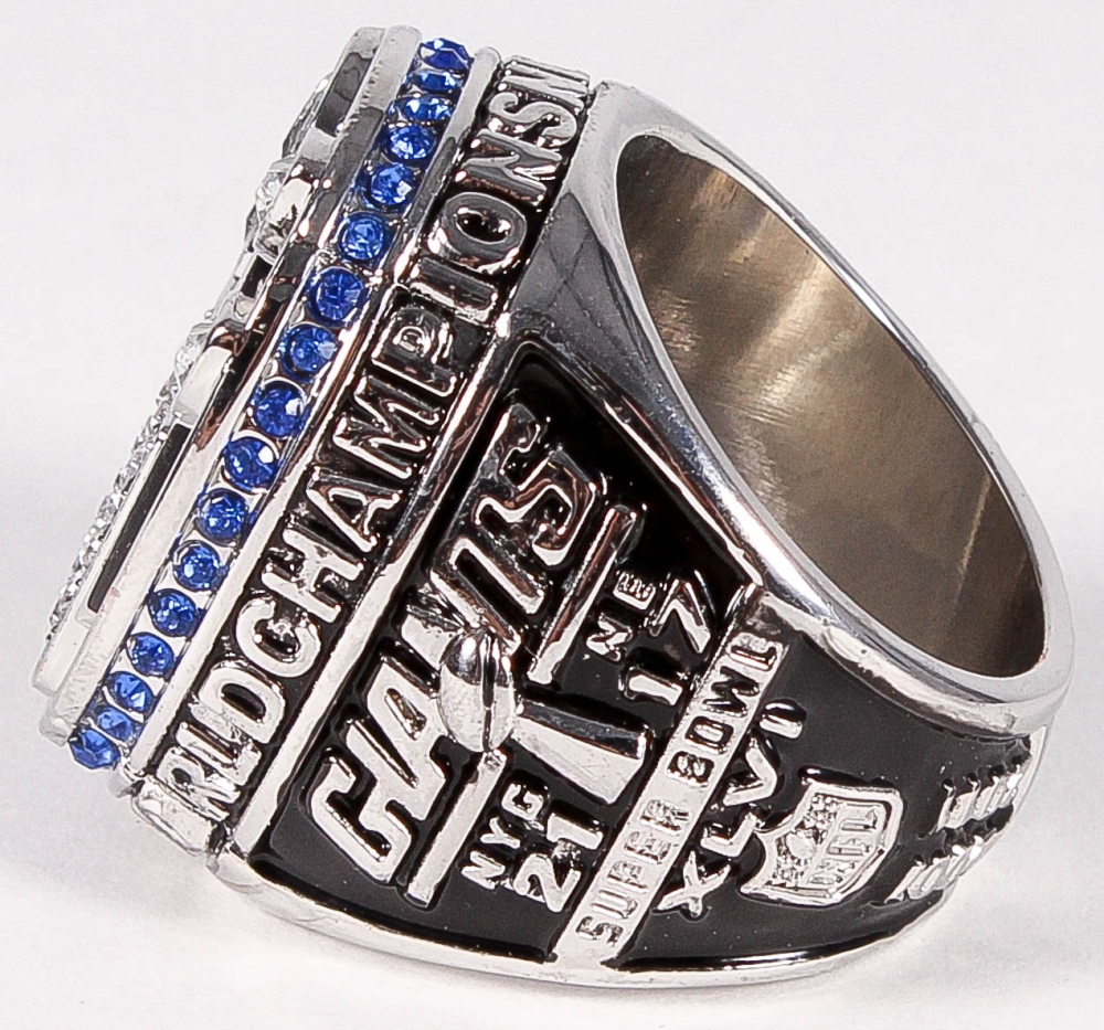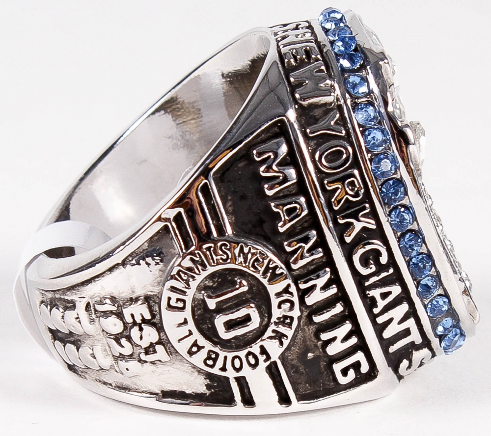Eli Manning New York Giants High Quality Replica 2011 Super Bowl XLVI Championship Ring. The ring has been hand crafted by professional jewelers. Made with metal alloy and clad with silver. Size 11.