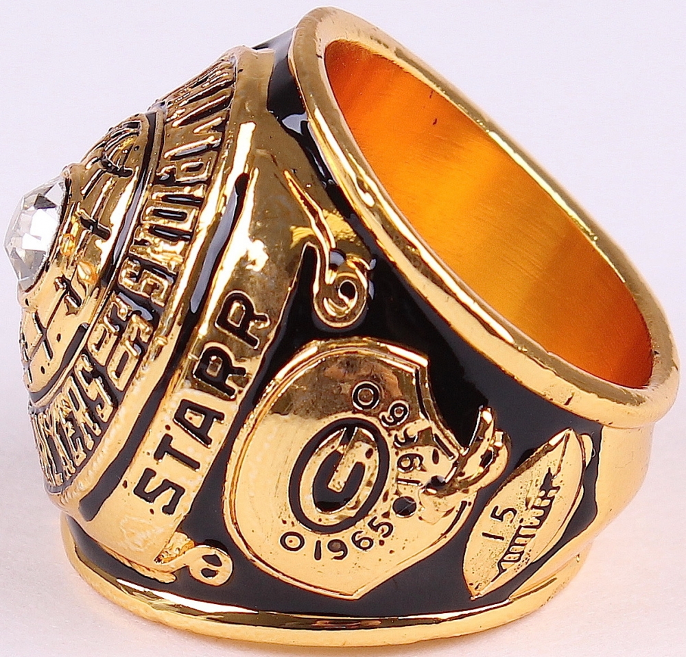 Bart Starr Green Bay Packers High Quality Replica 1966 Super Bowl I Championship Ring. The ring has been hand crafted by professional jewelers. Made of metal alloy and clad with 18K Gold. Size 11.