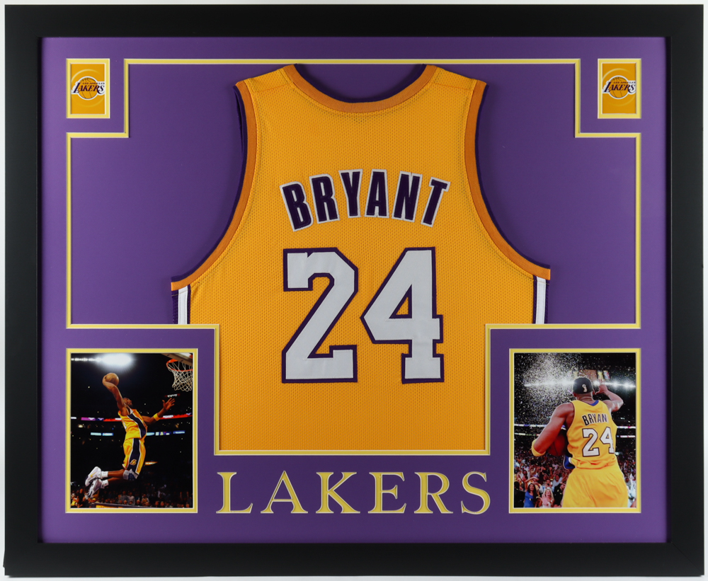Custom frame measures approximately 35" x 43" in size and features a jersey of Kobe Bryant (D. 2020, HOF). Please note, the display is unsigned.