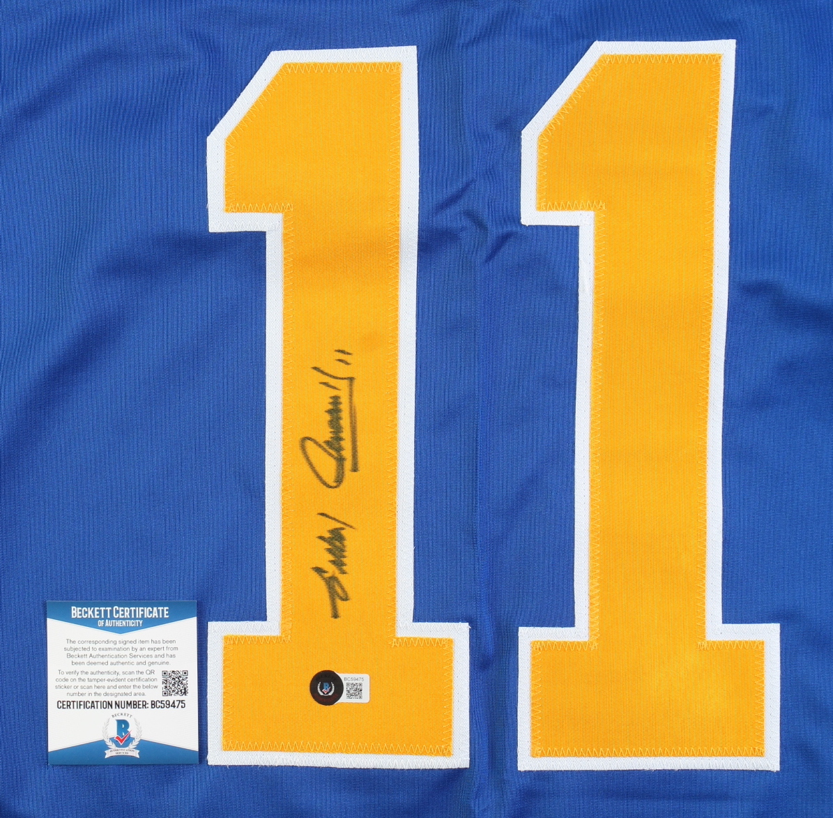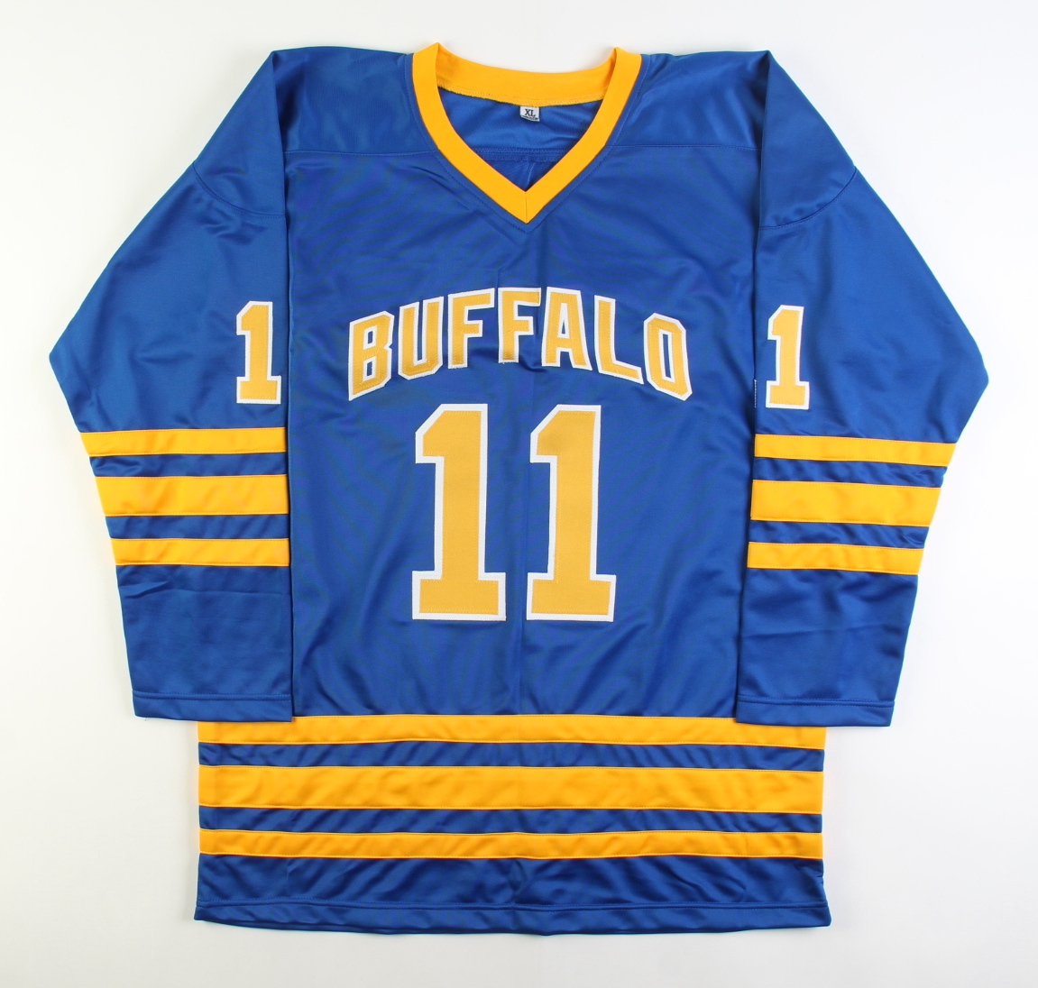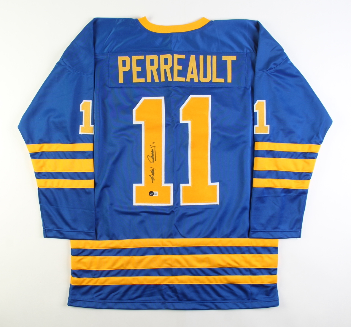 Custom on-ice style jersey. Everything is sewn on, size XL. Hand-signed by Gilbert Perreault (HOF).