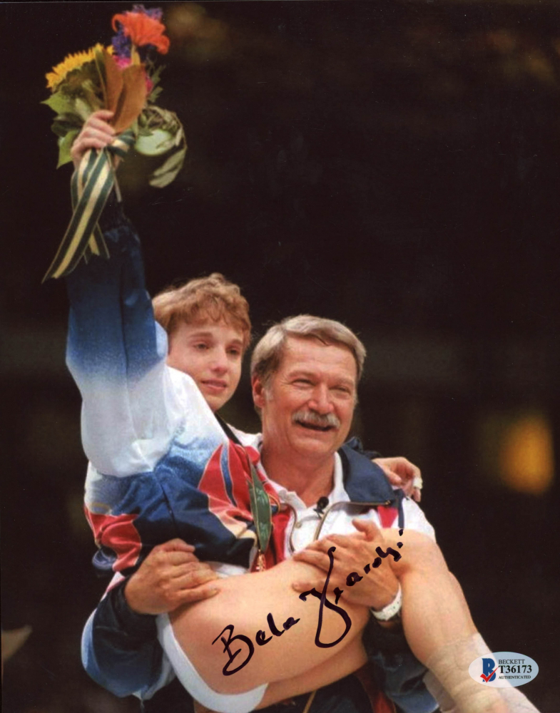 Photo measures 8" x 10" in size and has been hand-signed by Bela Karolyi.