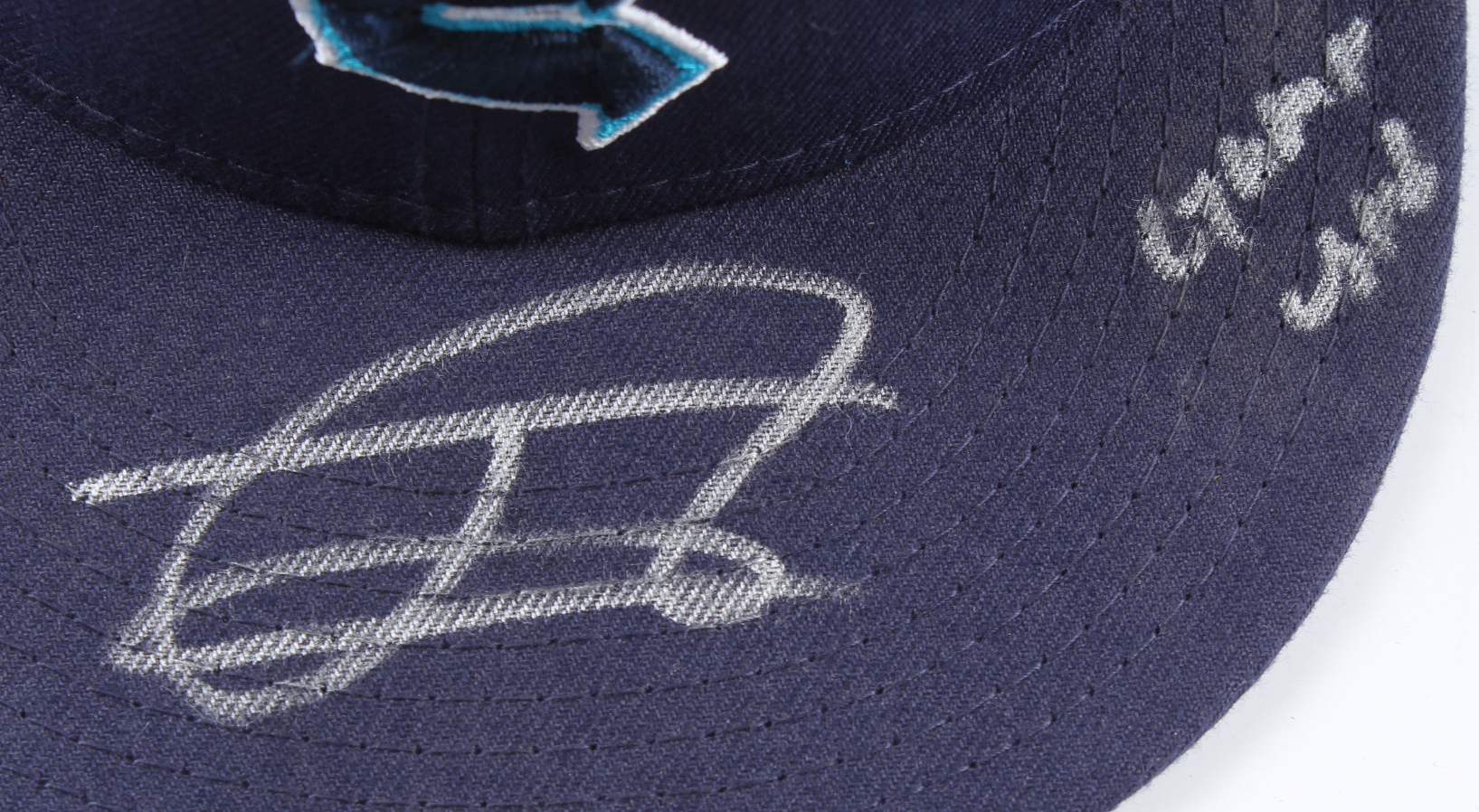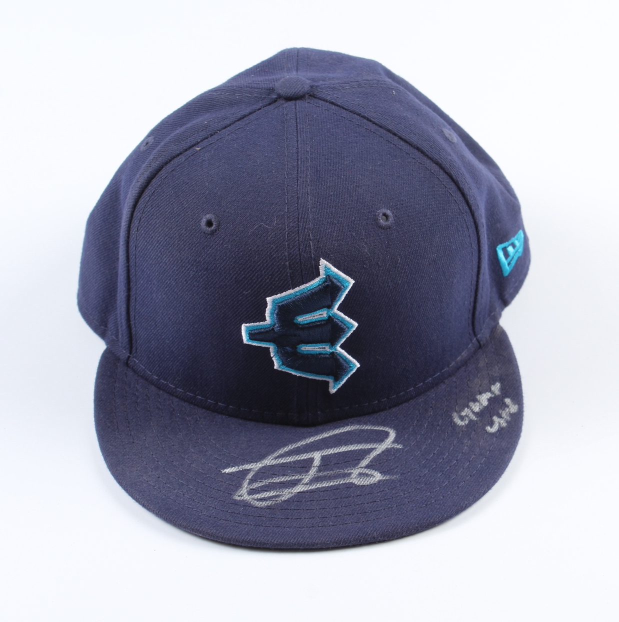 New Era Everett AquaSox fitted baseball hat, size 7 1/2, has been hand-signed and inscribed on the brim by Julio Rodriguez (Seattle Mariners). Please note, the hat has been game-used and shows signs of wear.