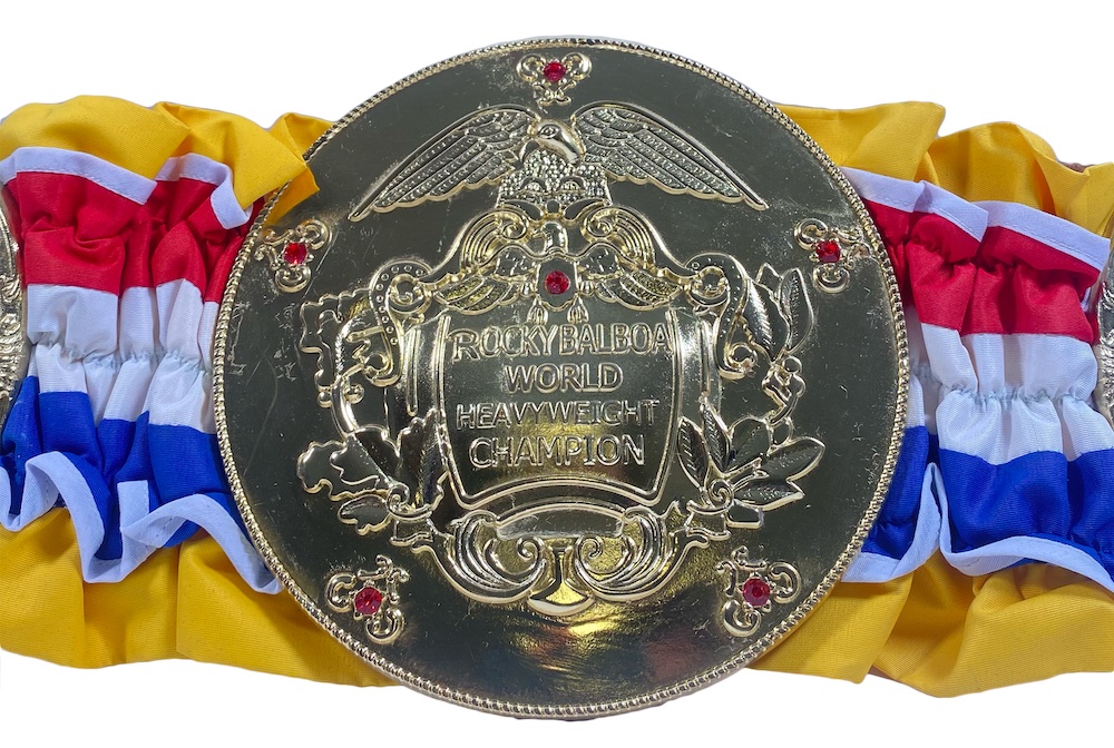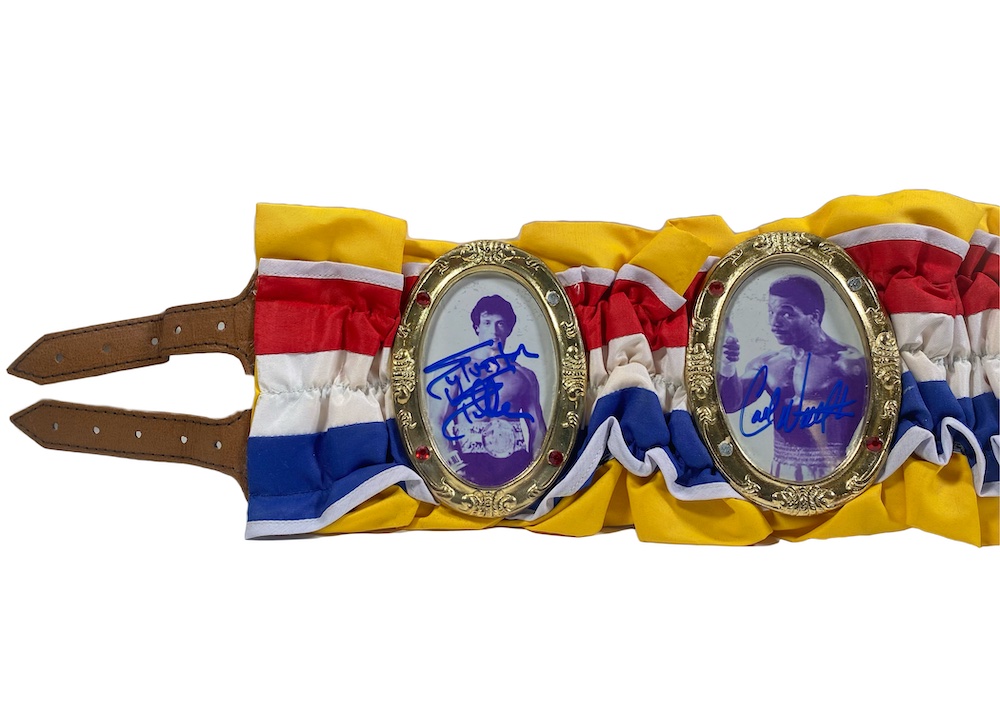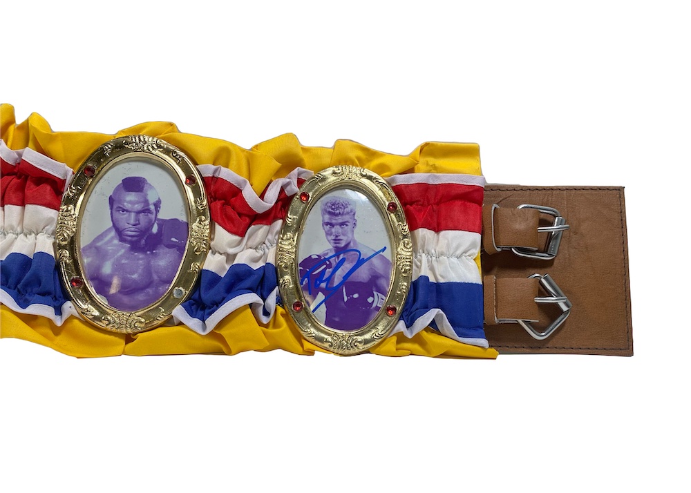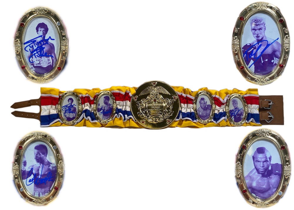 "Rocky Balboa" World Heavyweight Championship Wrestling replica belt. Hand-signed by Sylvester Stallone (Rocky Balboa), Carl Weathers (Apollo Creed) and Dolph Lundgren (Ivan Drago).