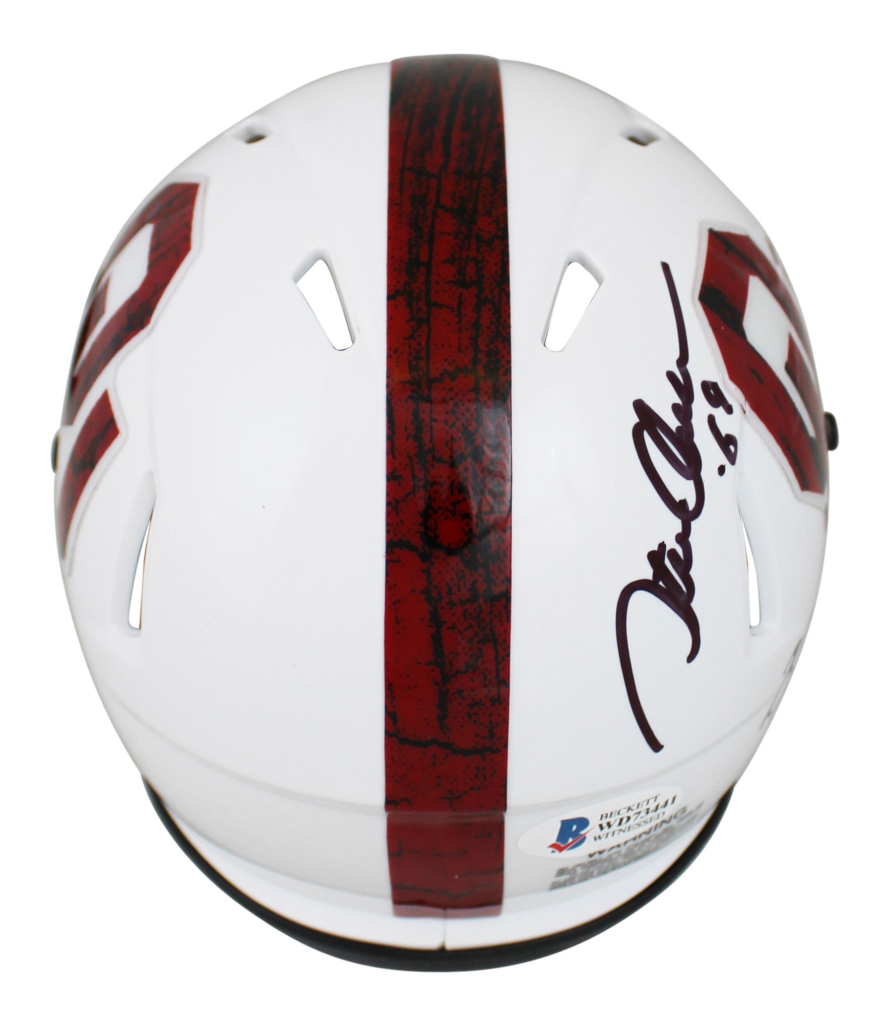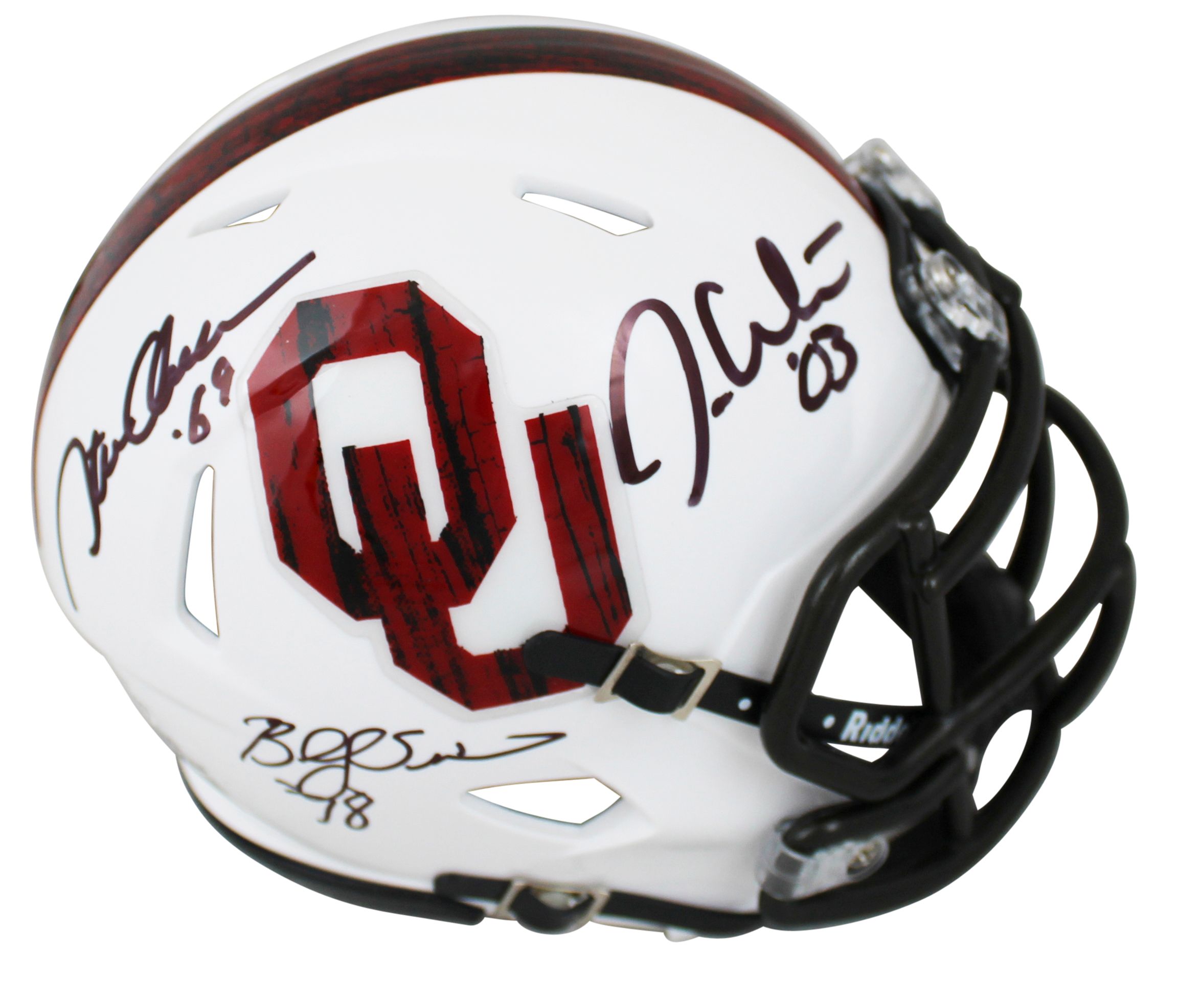 Riddell Oklahoma Sooners speed mini helmet has been hand-signed and inscribed by (3) former Oklahoma Sooners players and Heisman Trophy winners including Jason White, Billy Sims, and Steve Owens.