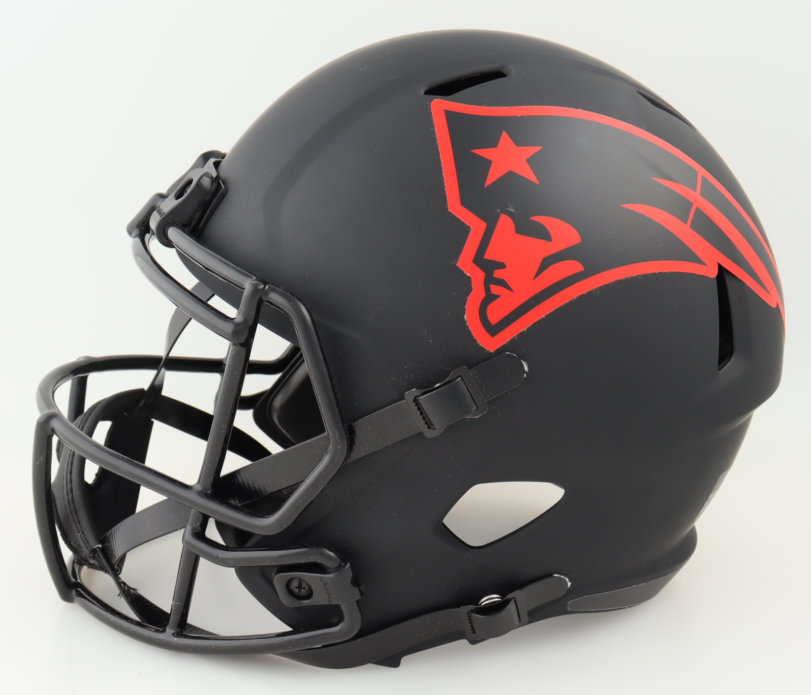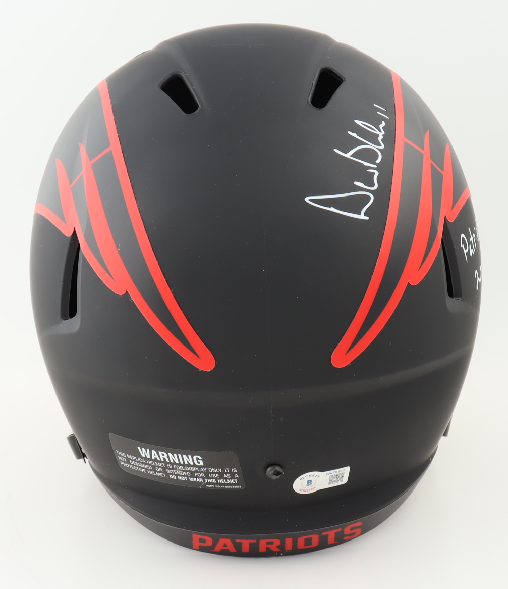 Riddell New England Patriots full-size replica eeclipse alternate speed helmet. Hand-signed and inscribed by Drew Bledsoe.