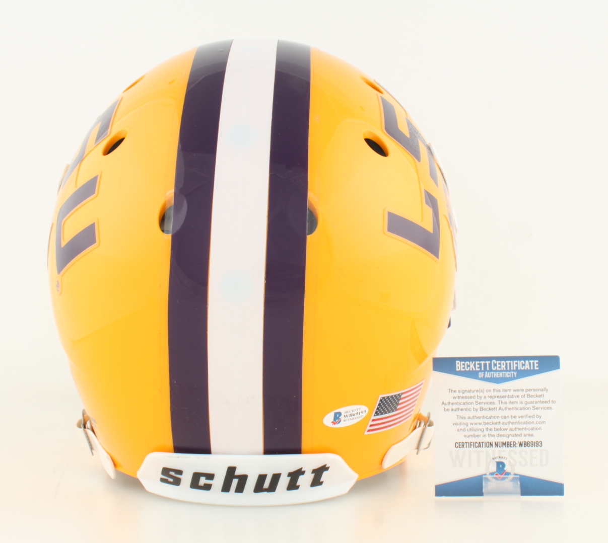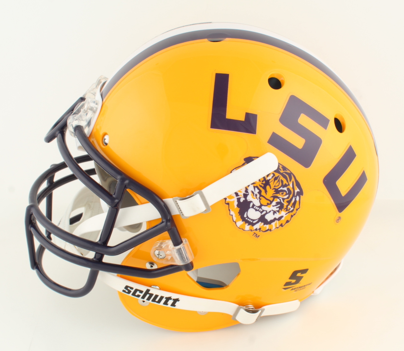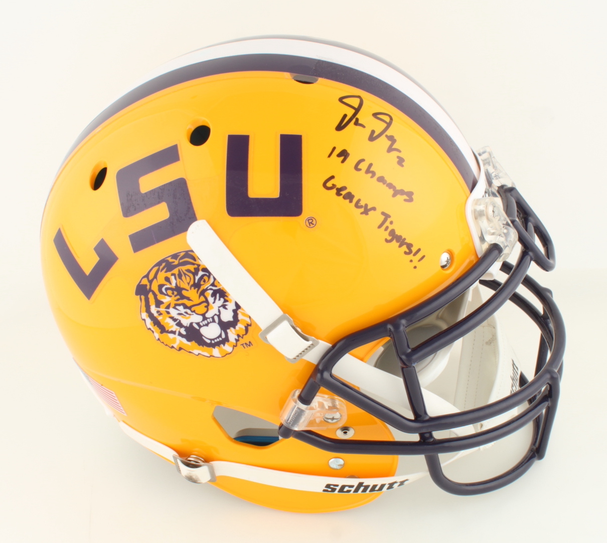 Schutt LSU TIgers full-size authentic on-field helmet. Has been hand-signed and inscribed by Justin Jefferson.