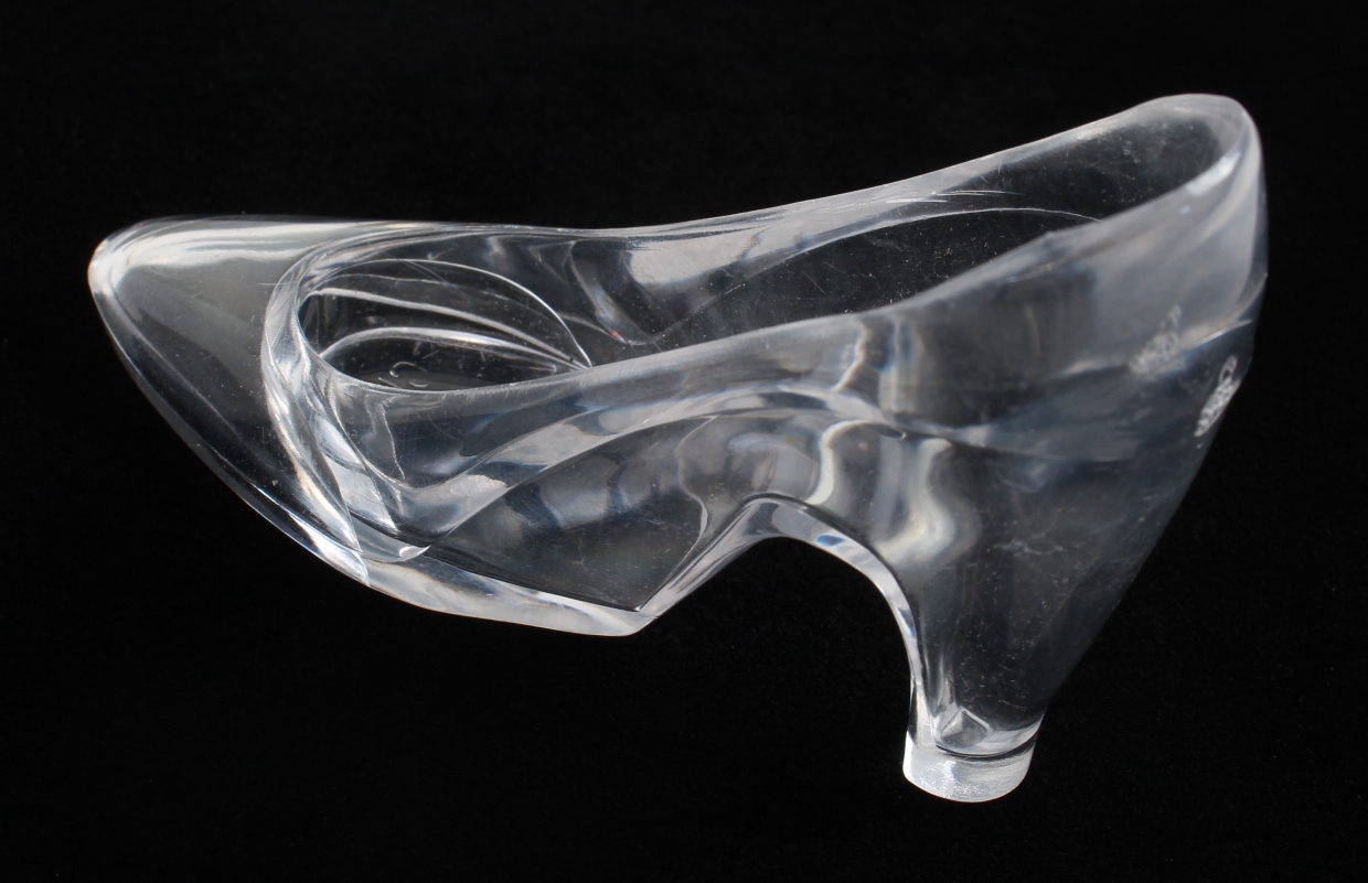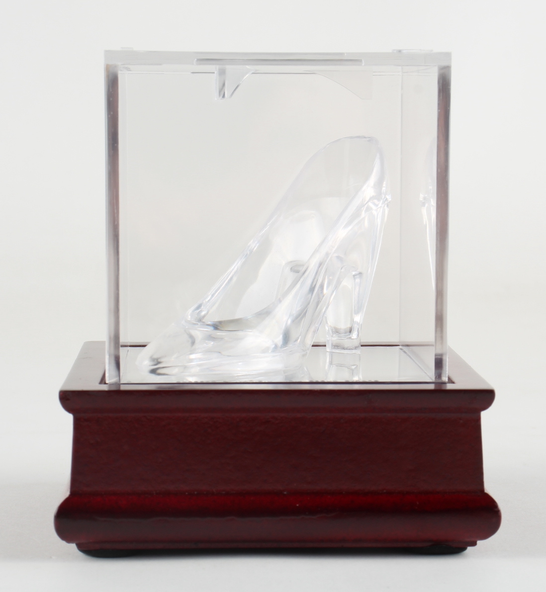 Vintage Disneyland "Cinderella" glass slipper figurine. Item measures approximately 4.5" in height and includes a display case with a wooden base.