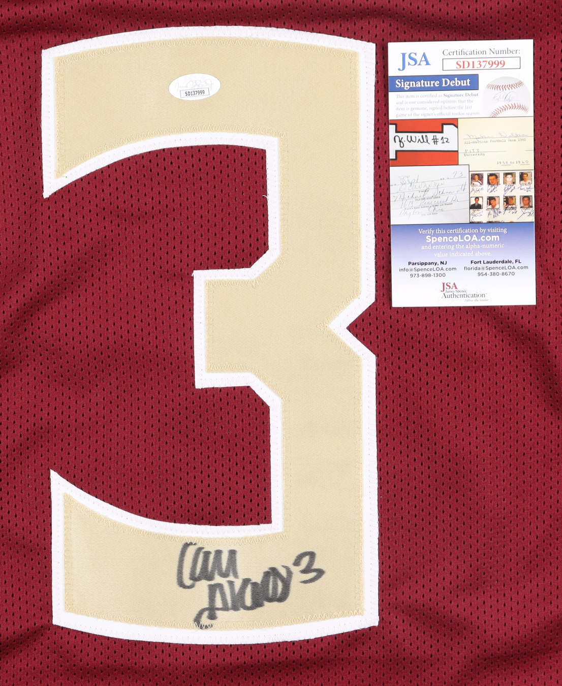 The autograph(s) includes an official James Spence Authentication (JSA) "Signature Debut" hologram and COA. "Signature Debut" is the autographed memorabilia equivalent to a rookie card. The JSA definition of a "Signature Debut" is as follows: "Any item that is autographed and received by JSA prior to the last game of the signer's official rookie season.