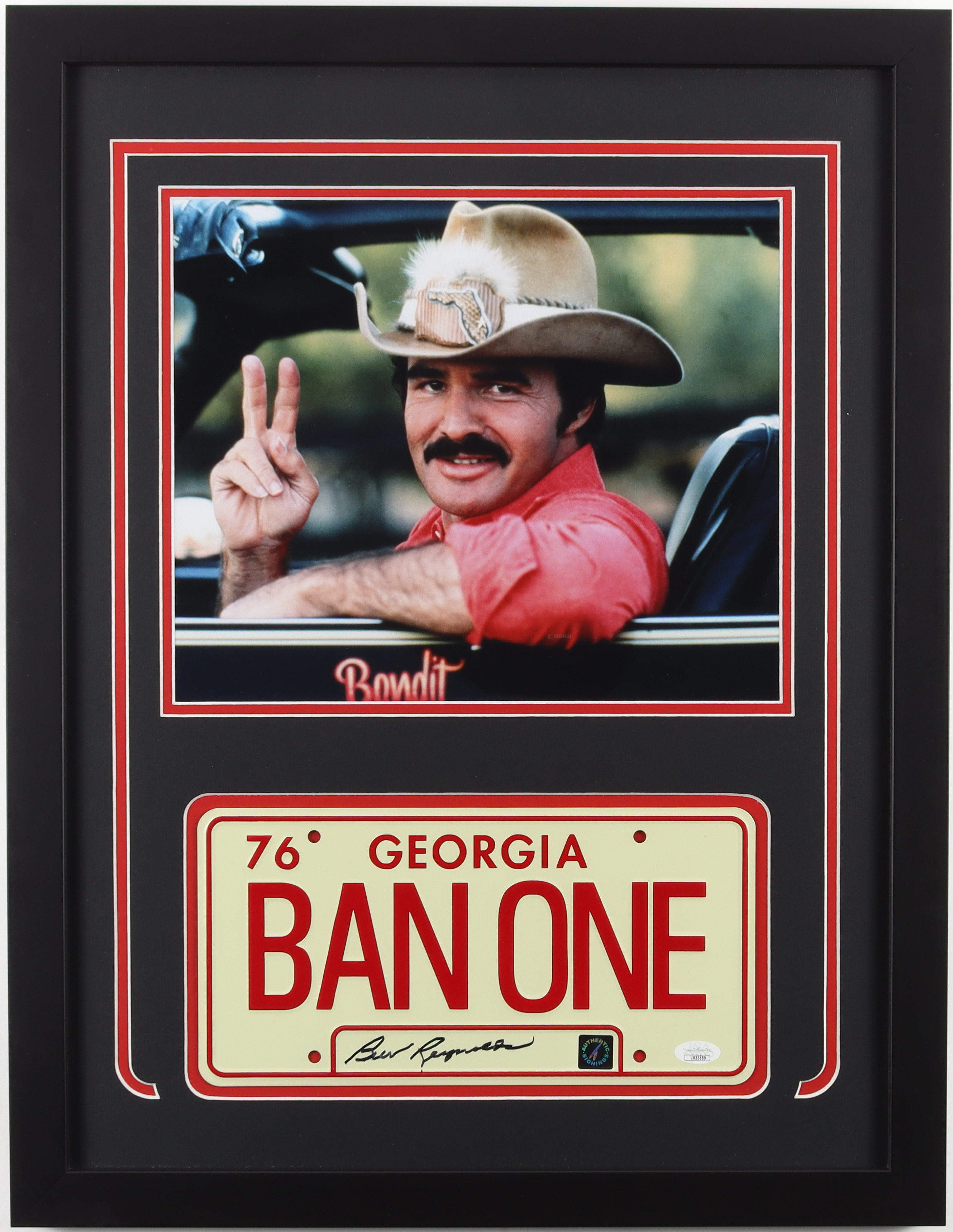 Custom Framed display measures 20" x 25" in size. Features a license plate that is hand signed by Burt Reynolds (D. 2018). Display also includes a photo of Burt Reynolds.