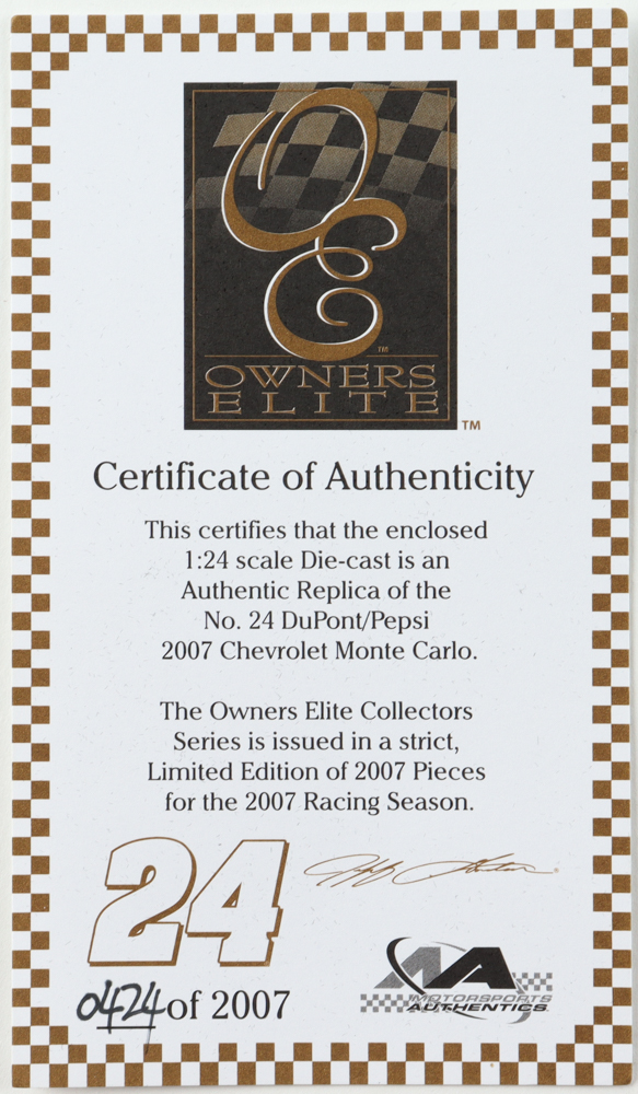Jeff Gordon Signed LE NASCAR #24 Pepsi 2007 Monte Carlo SS Owners Elite 1:24 Scale Diecast Car (Gordon)