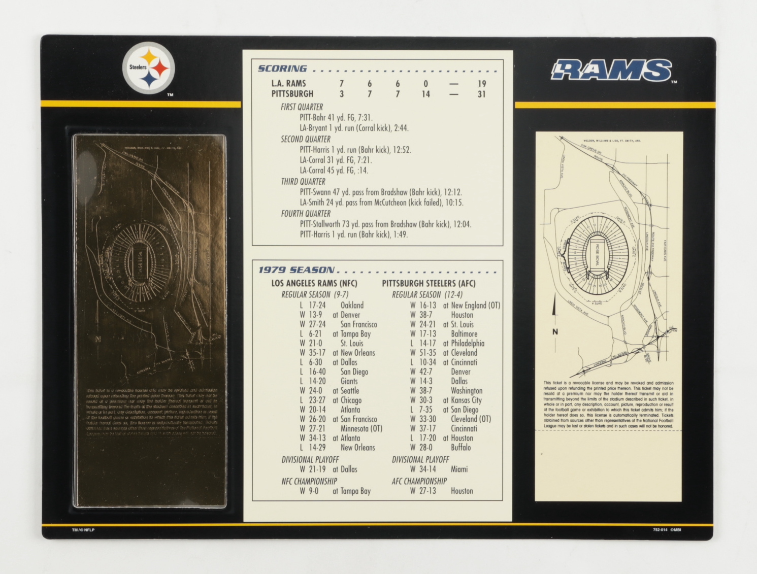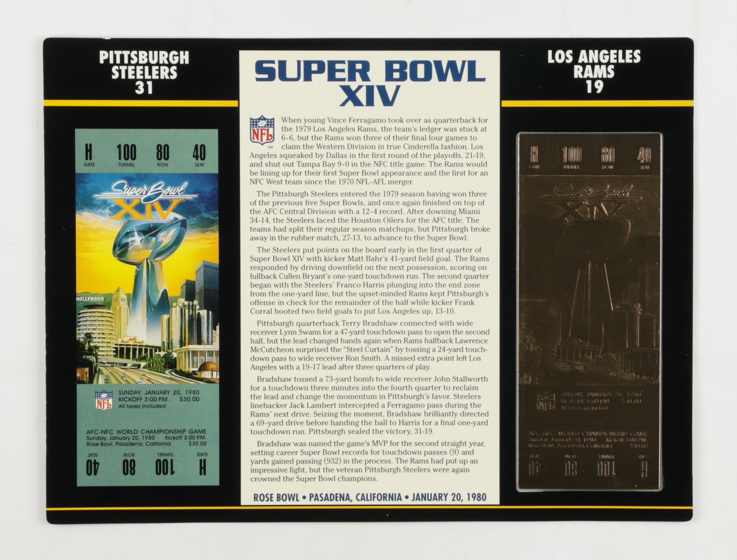 1980 Commemorative Super Bowl XIV Card with Ticket: Steelers vs Rams