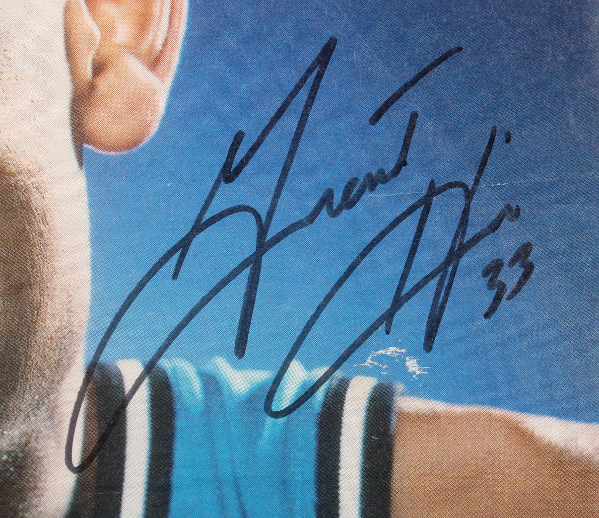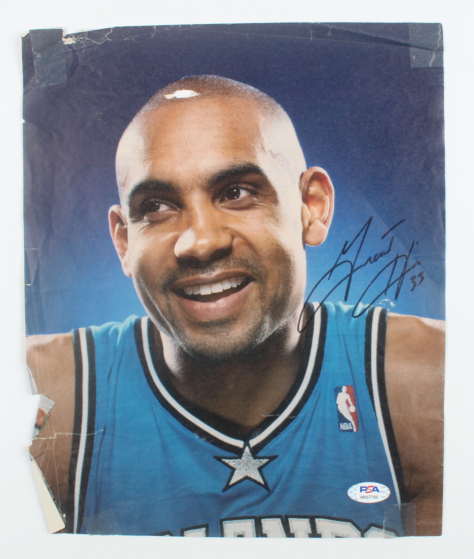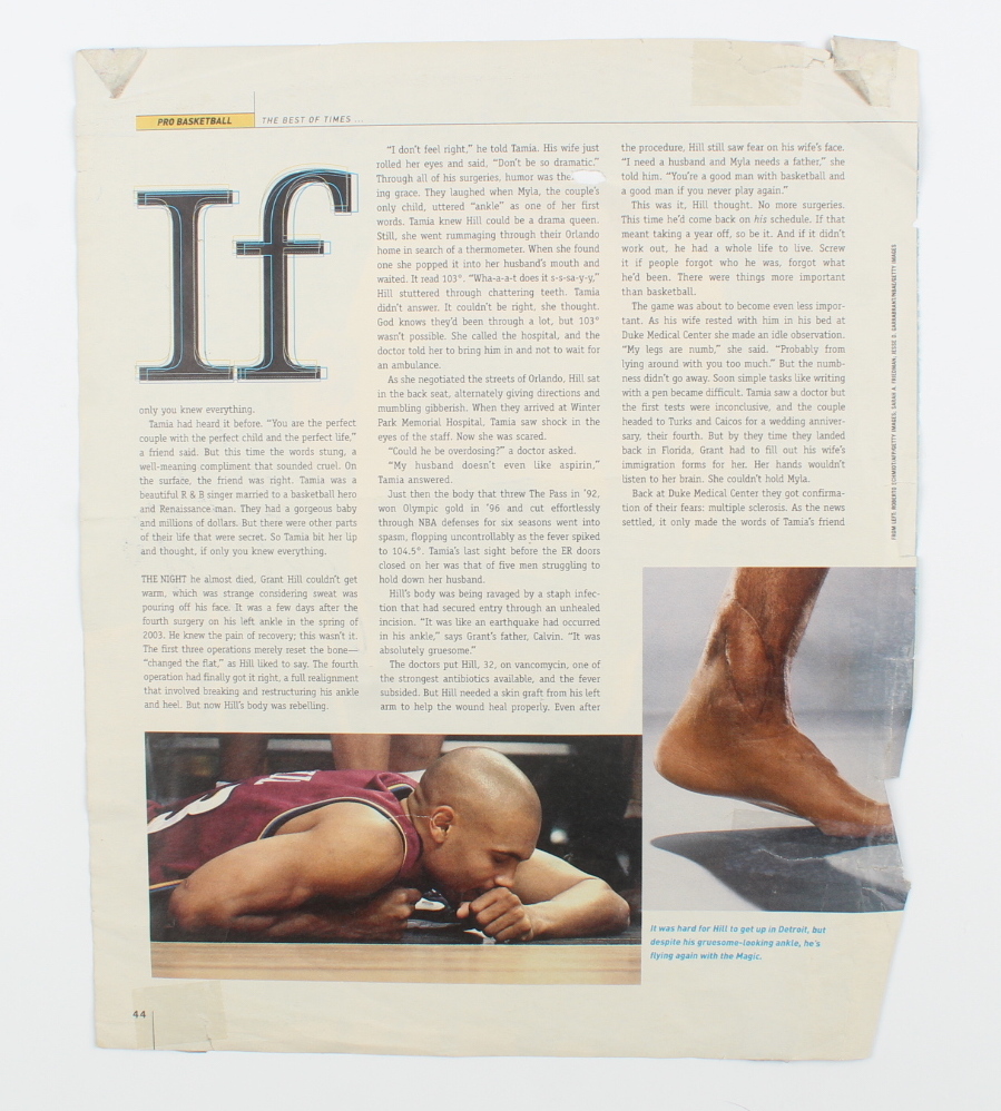 Magazine page measures 10" x 12" in size. Hand-signed by Grant Hill (Orlando Magic, HOF). Please note, there are tears, tape and creasing on the corners and borders of the photo.
