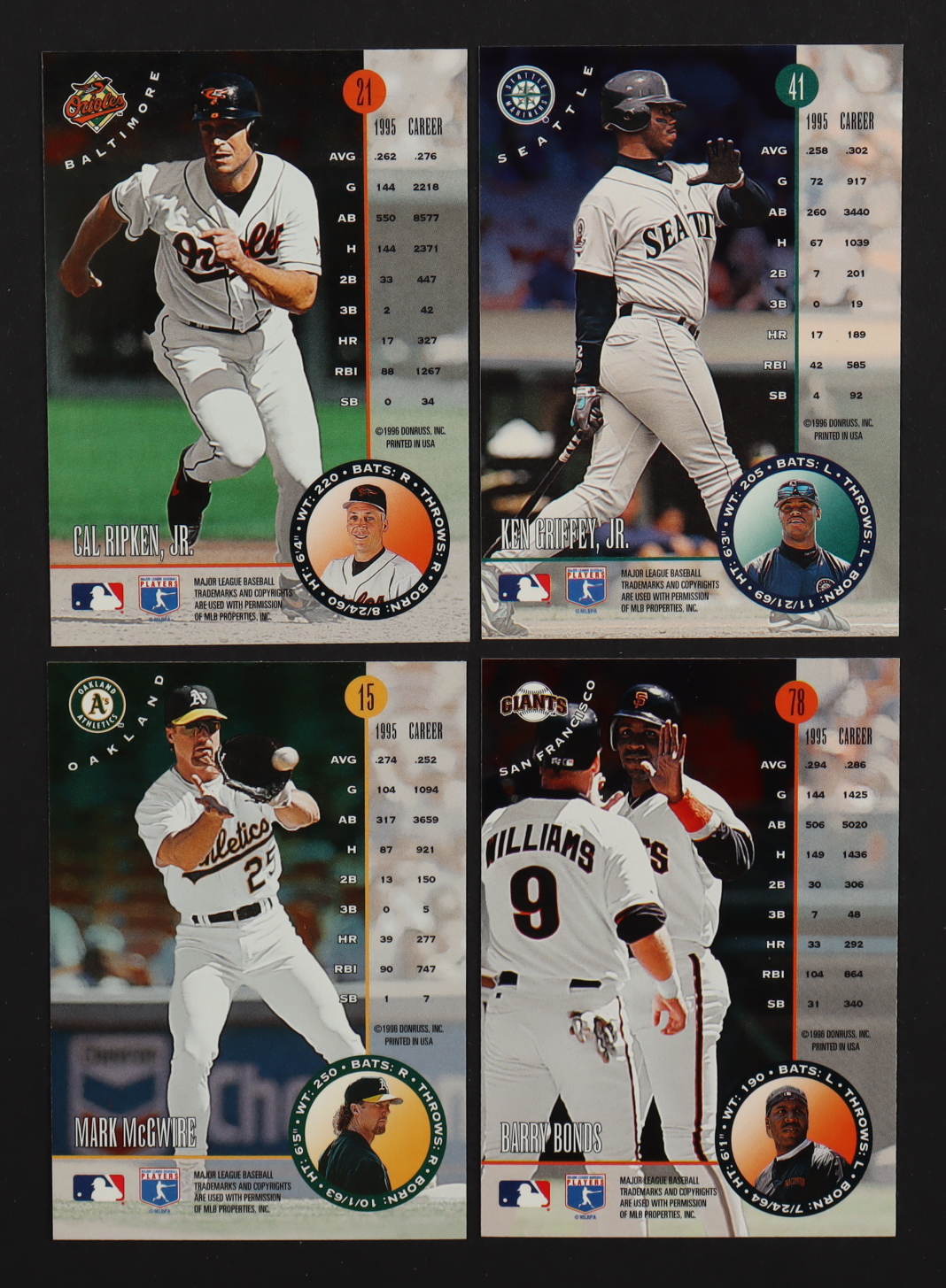 1996 Leaf Baseball Complete Set of (220) Cards with Cal Ripken #21, Ken Griffey Jr. #41, Mark McGwire #15, Barry Bonds #78