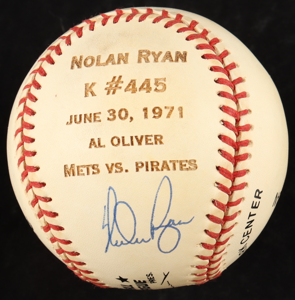 Rawlings Official National League custom engraved baseball that has been hand-signed by Nolan Ryan (Houston Astros, HOF). Ryan's June 30th, 1971 #445 career strikeout record has been custom engraved into the baseball. Please note, the baseball is naturally toned.