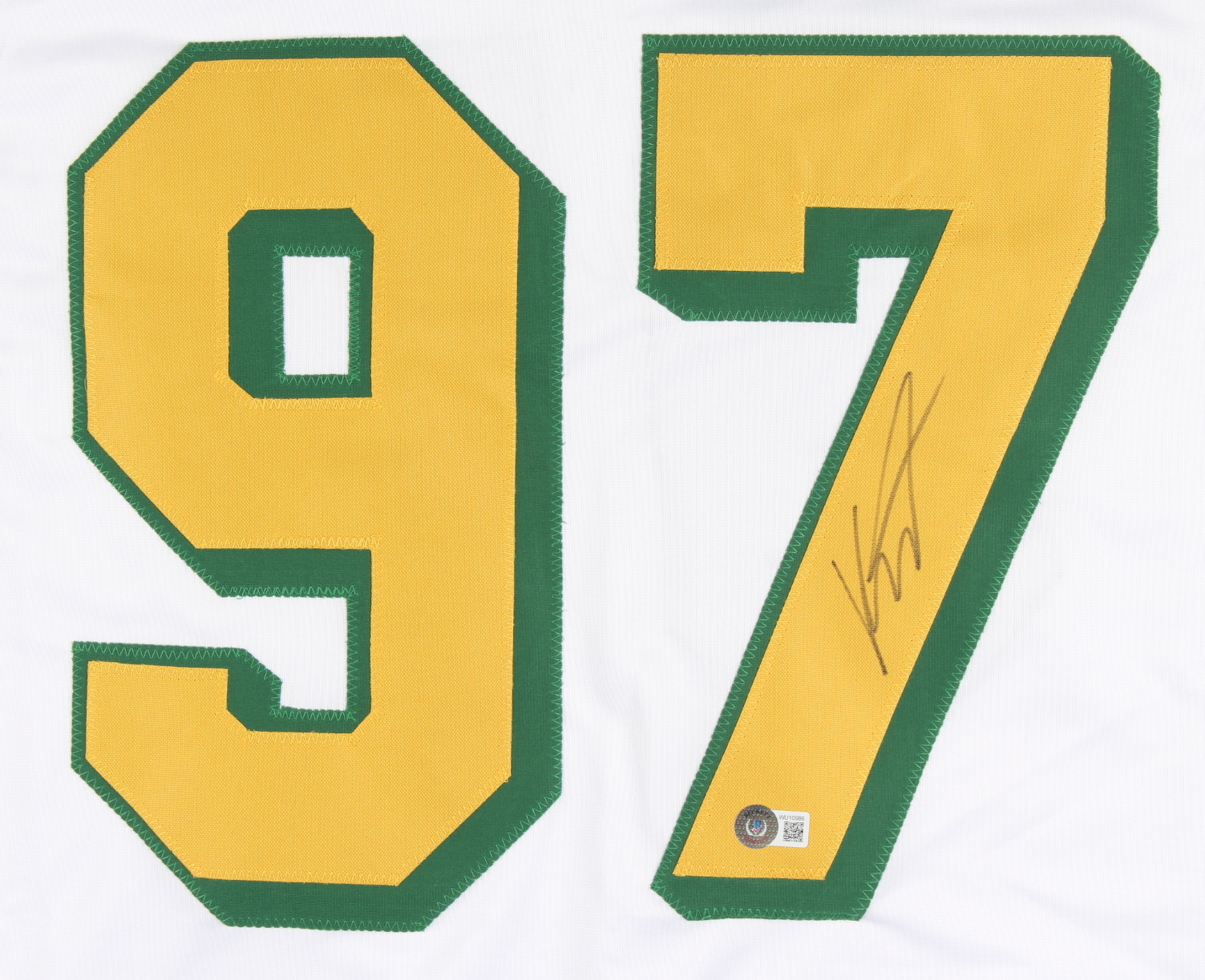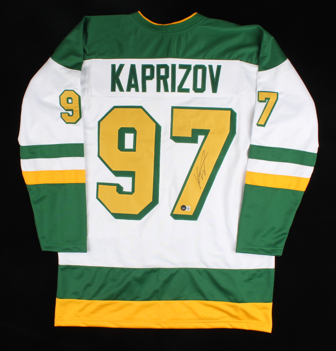 Custom on-ice style jersey. Everything is sewn on, size XL. Hand-signed by Kirill Kaprizov.