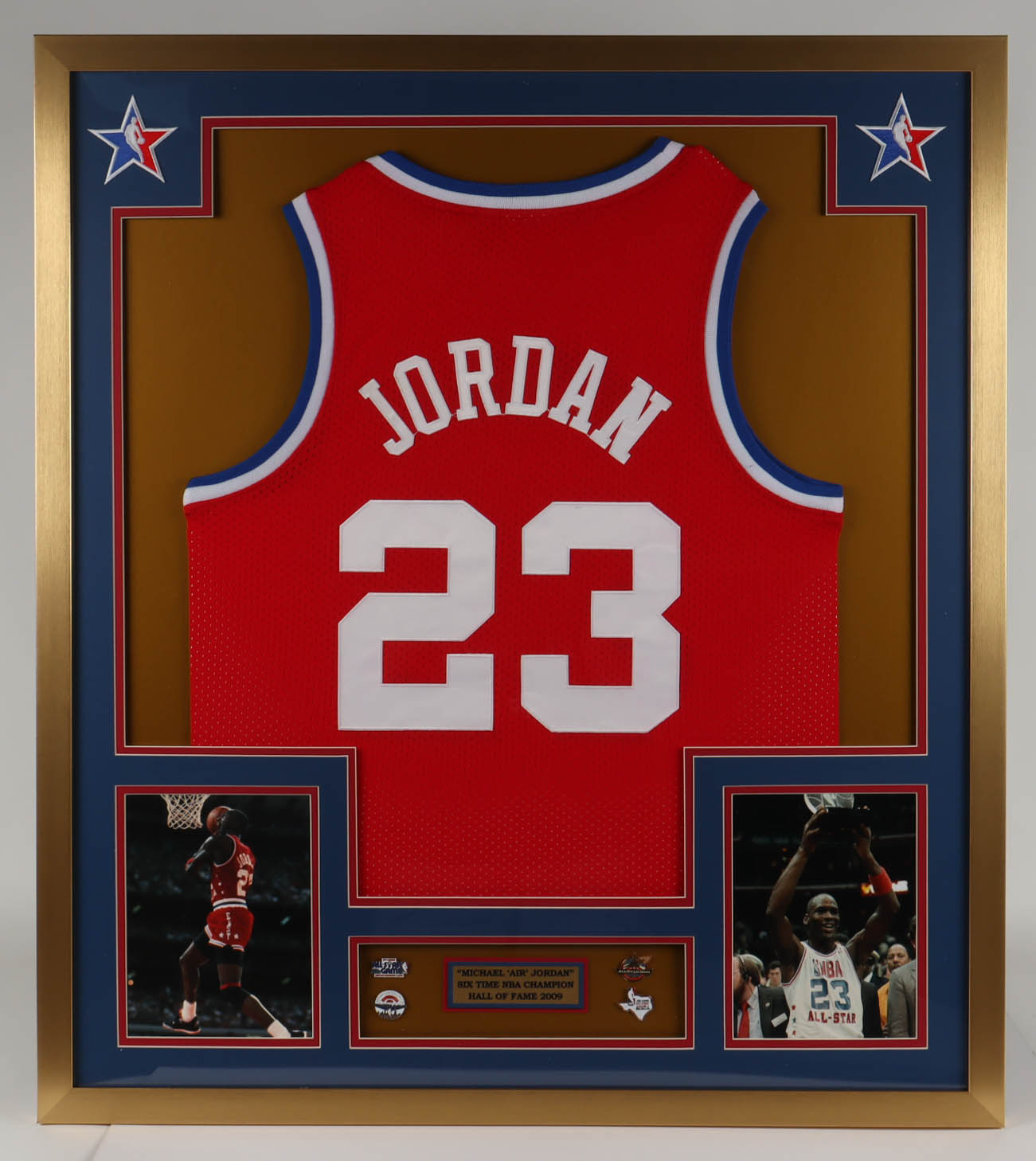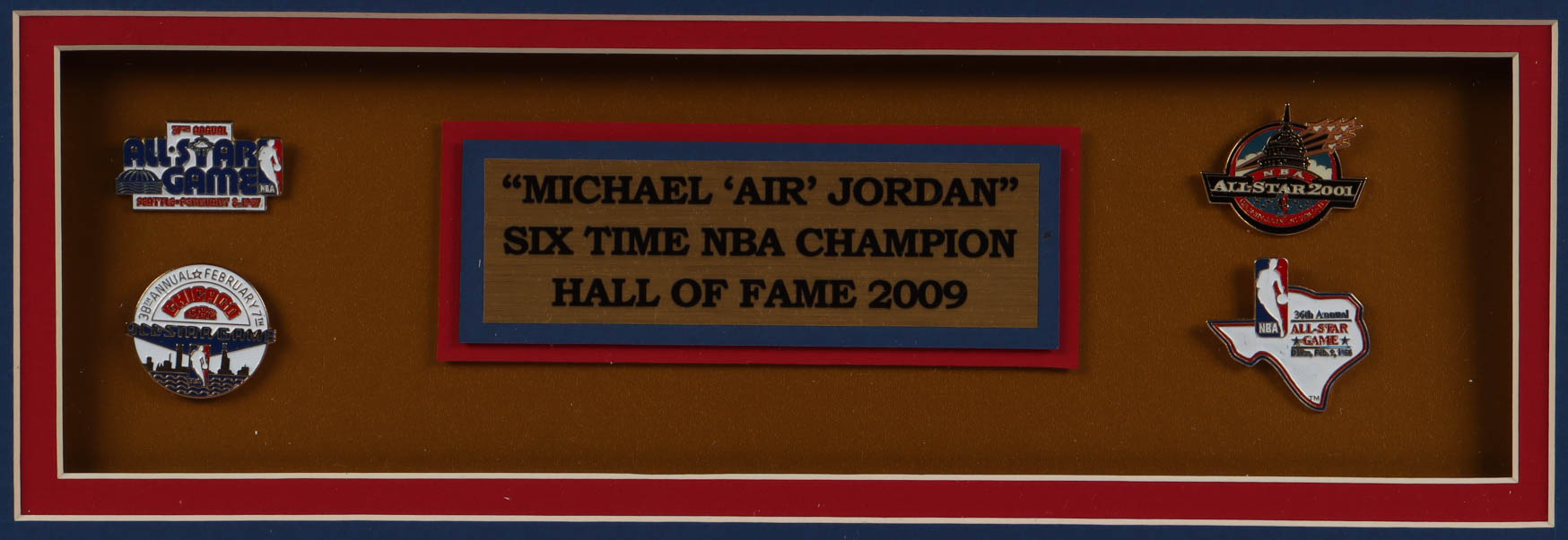 Michael Jordan 32x36 Custom Framed Jersey Display with (4) Michael Jordan All-Star Pins