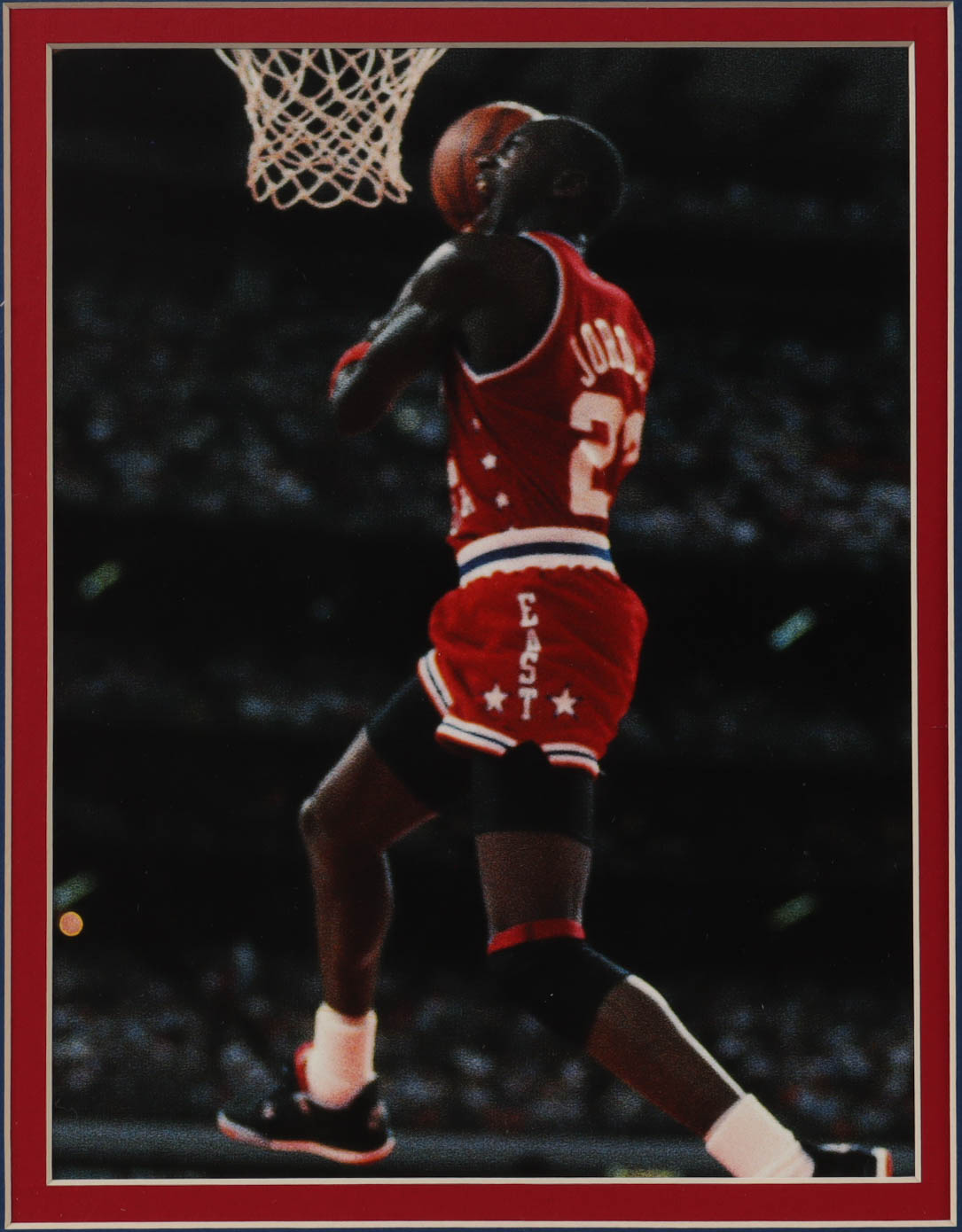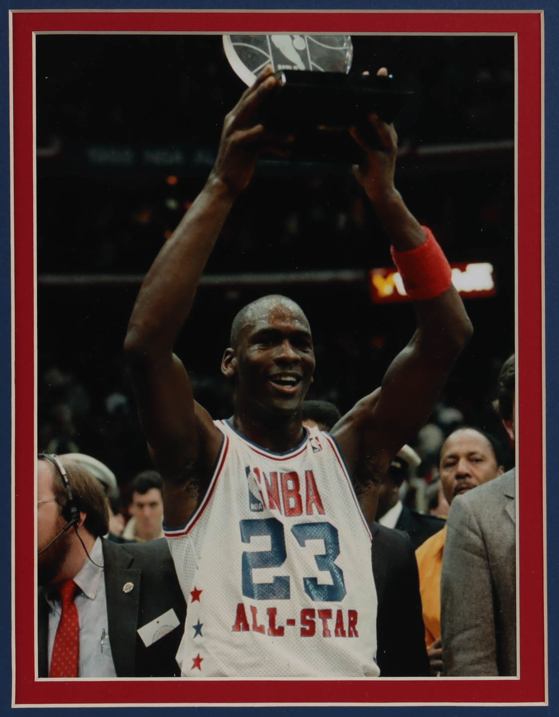 Custom framed display measures 32" x 36" in size. Features a Michael Jordan (Chicago Bulls, HOF) jersey as well as (2) photos and (4) All-Star pins. Please note, the display is not signed.
