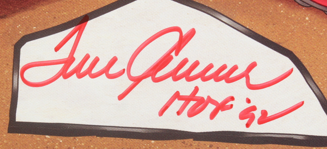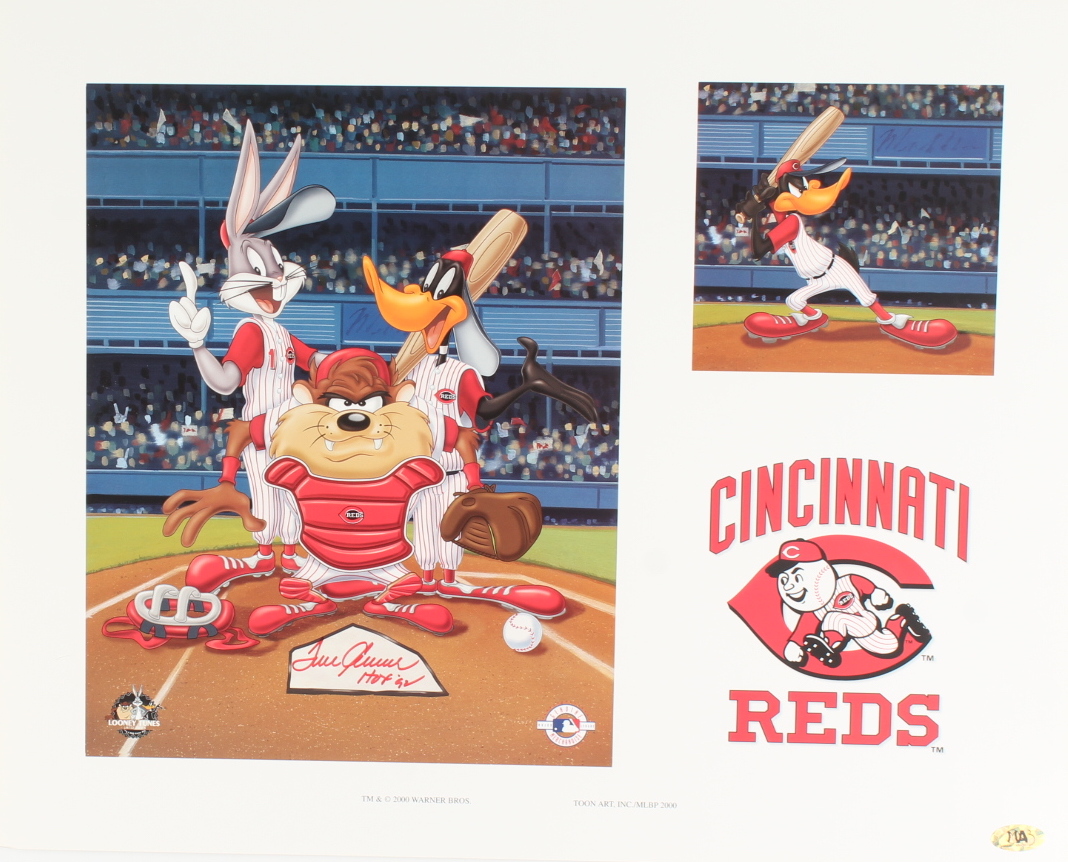Lithograph measures 16" x 20" in size and is hand-signed and inscribed by Tom Seaver (Cincinnati Reds, HOF). Display features the Looney Tunes characters posing at the plate for a photo in Cincinnati Reds uniforms.