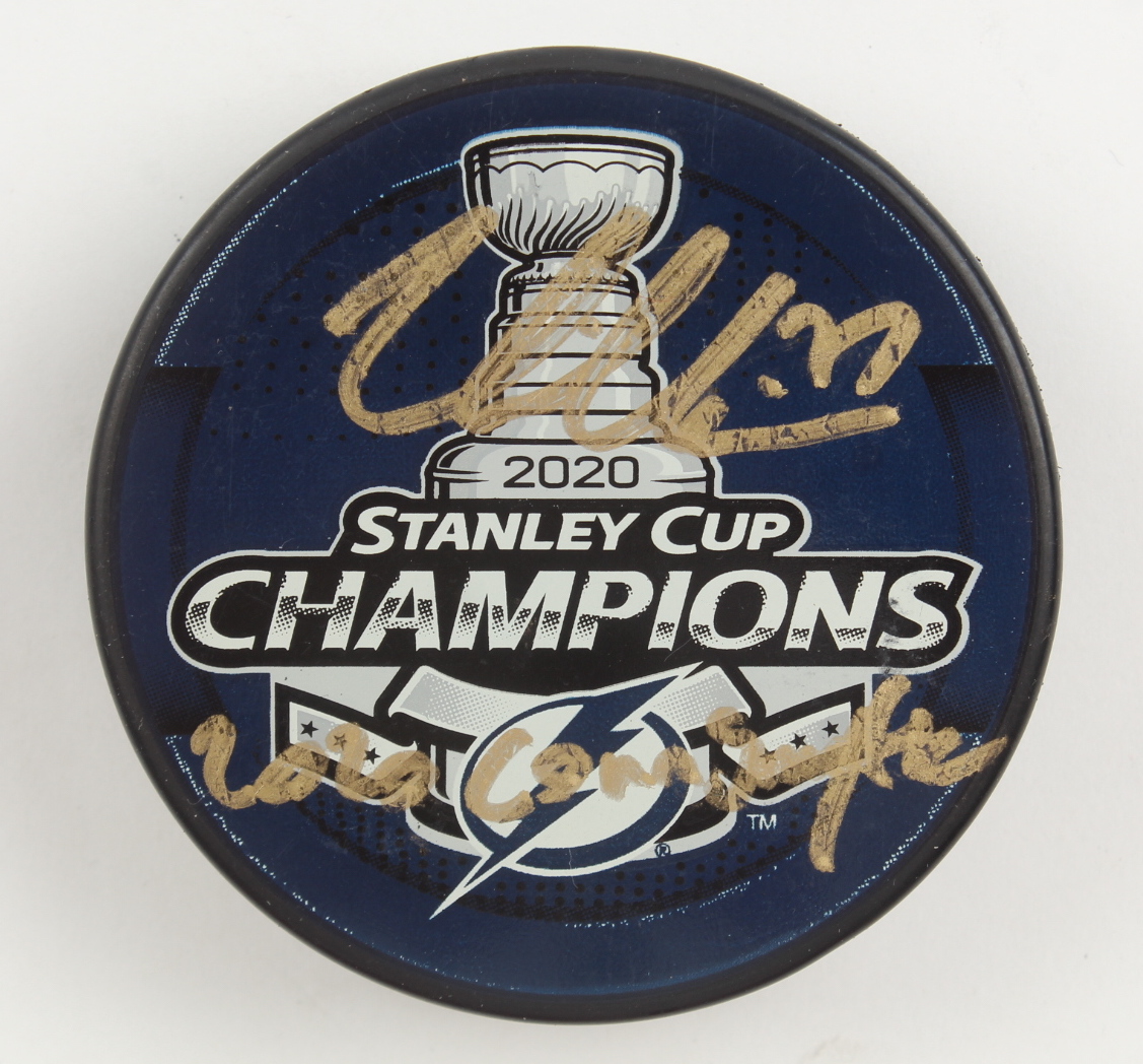 2020 Stanley Cup Champions logo hockey puck. Has been hand-signed and inscribed by Victor Hedman (Tampa Bay Lightning).