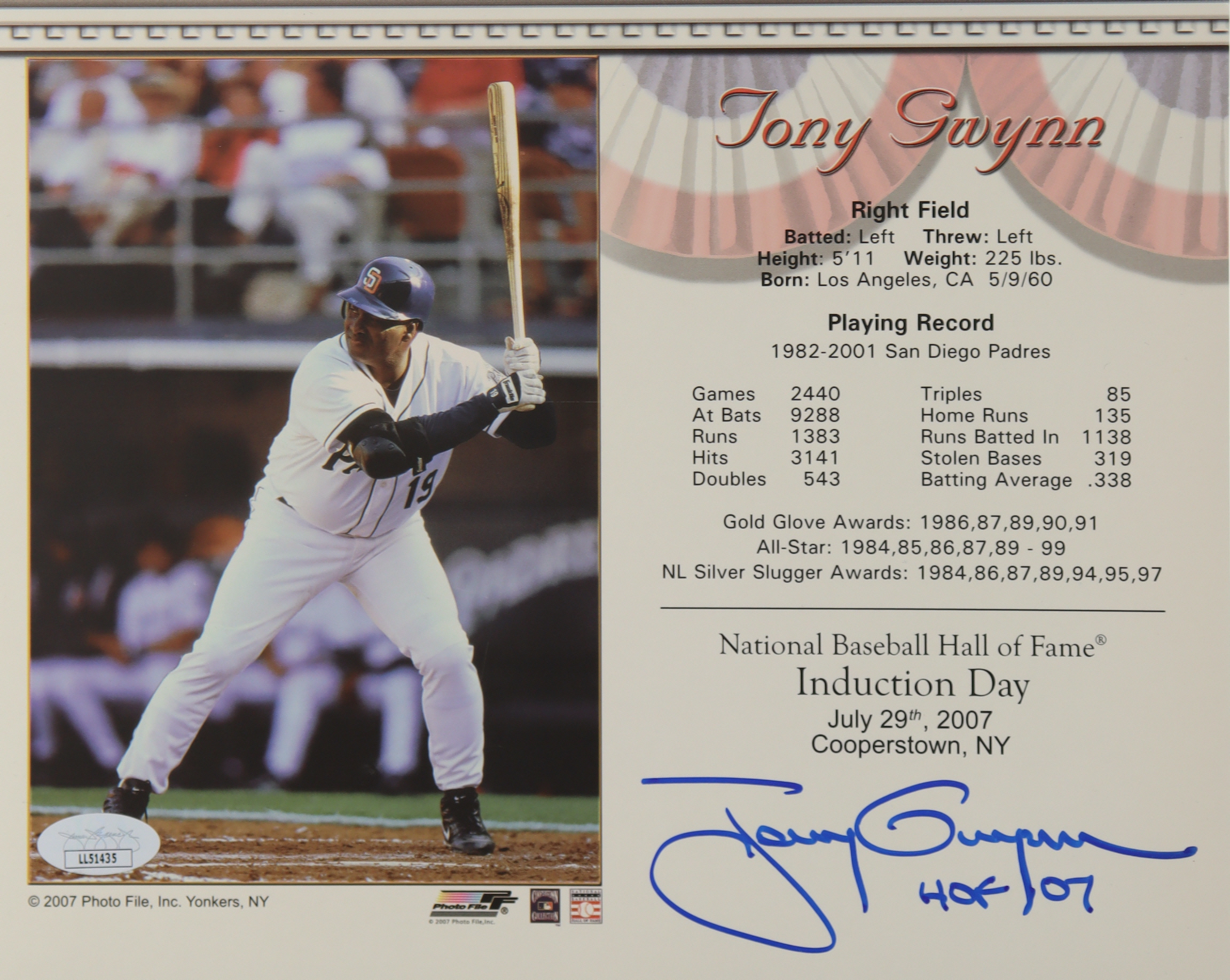 Tony Gwynn Signed Padres 8x10 Career Highlight Stat Card Inscribed "HOF 07" (JSA)