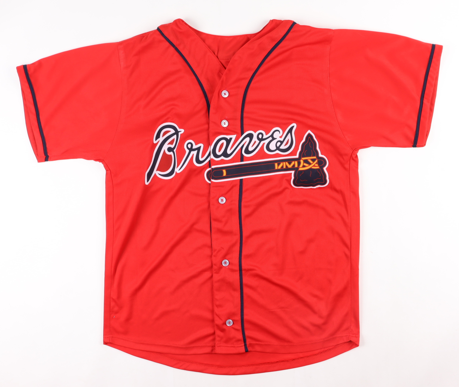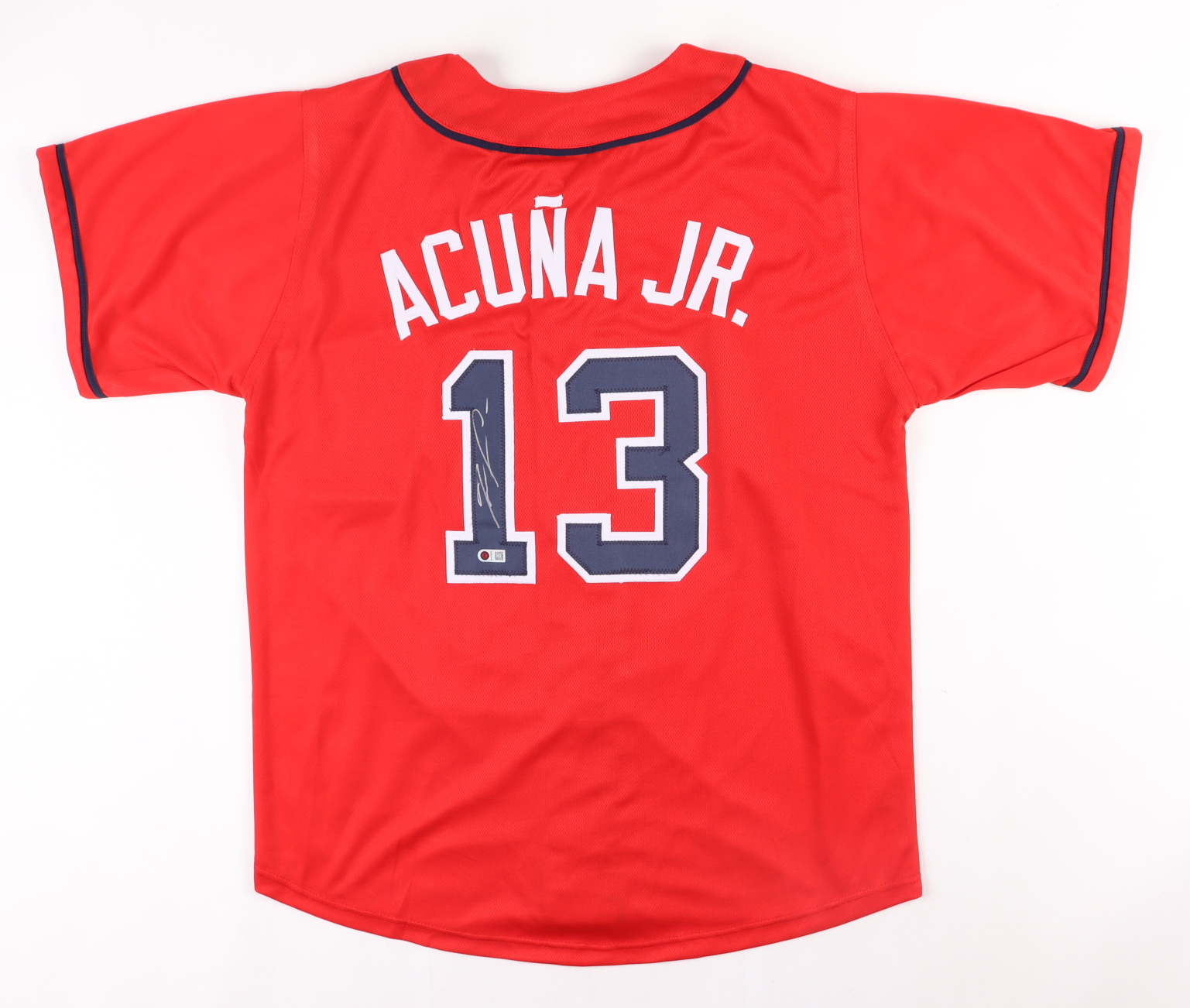Custom on-field style jersey. Everything is sewn on, size XL. Hand-signed by Ronald Acuna Jr.