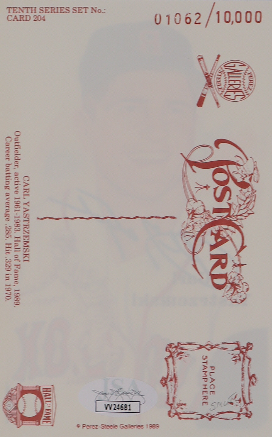 Postcard measures approximately 3" x 5" in size and has been hand-signed by Carl Yastrzemski (Boston Red Sox, HOF). Postcard is limited edition and has been numbered #01062/10,000.