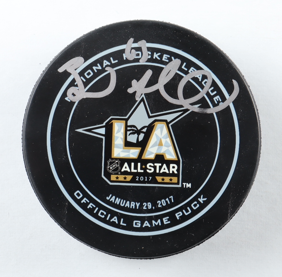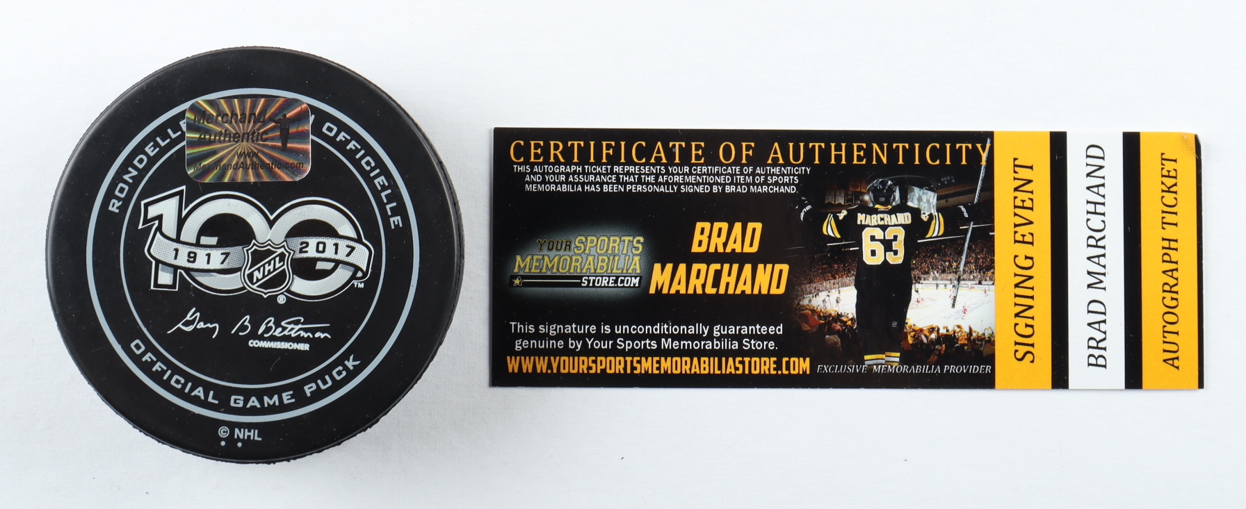 2017 All-Star Game logo hockey puck has been hand-signed by Brad Marchand (Boston Bruins).