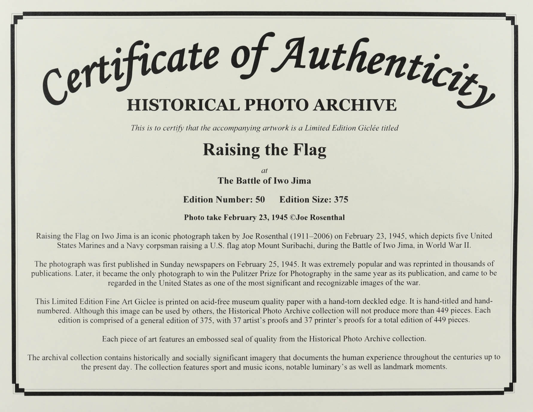 This Limited Edition Fine Art Giclee measures 18" x 21.5" is printed on acid-free museum quality paper with a hand-torn deckled edge. It is hand-titled and hand-numbered. Each piece of art features an embossed seal of quality from Historical Photo Archive collection. All though this image can be used by others, the Historical Photo Archive collection will not produce more than 375 pieces.