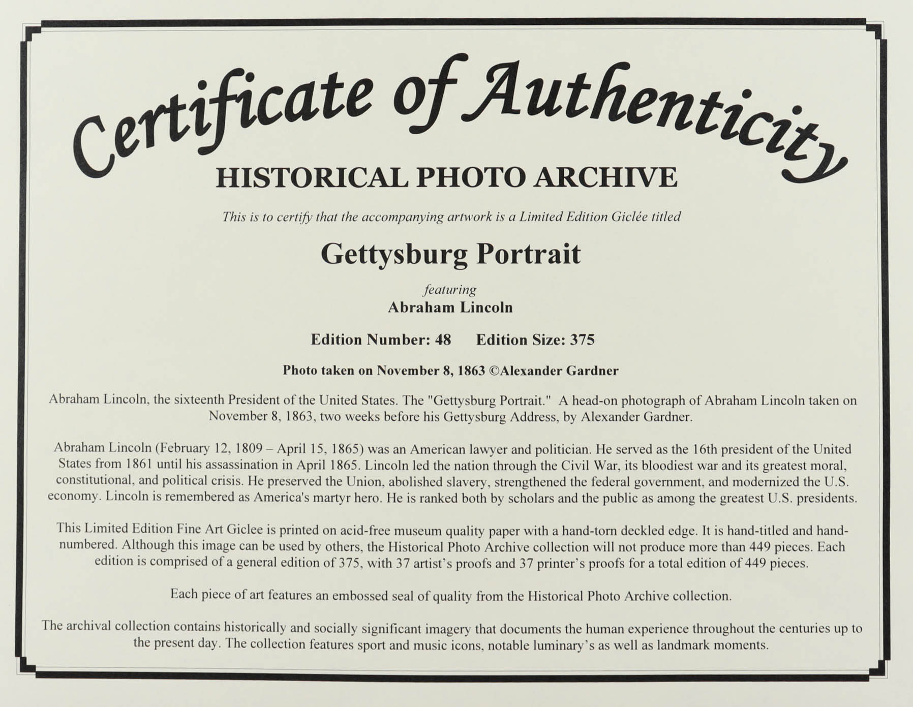 Historical Photo Archive - Abraham Lincoln “Gettysburg Portrait” LE 16.5x22 Fine Art Giclee on Paper #48/375