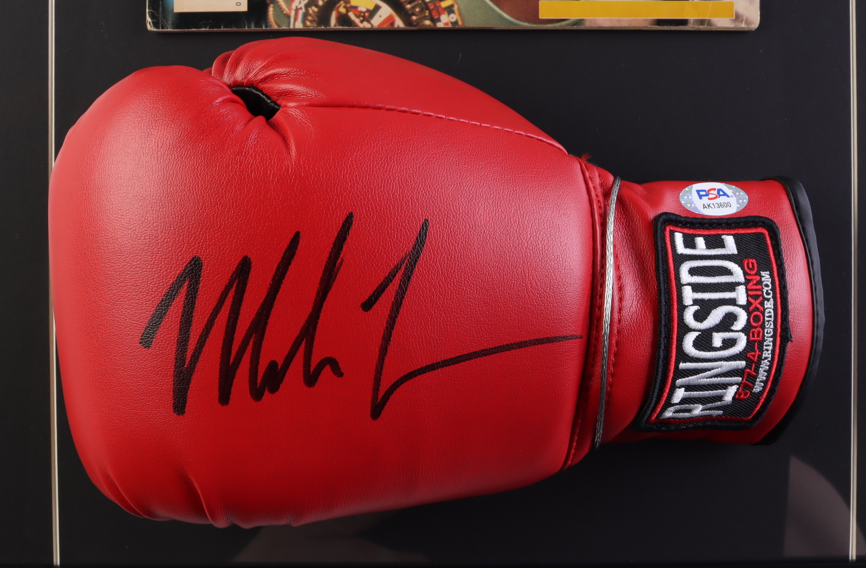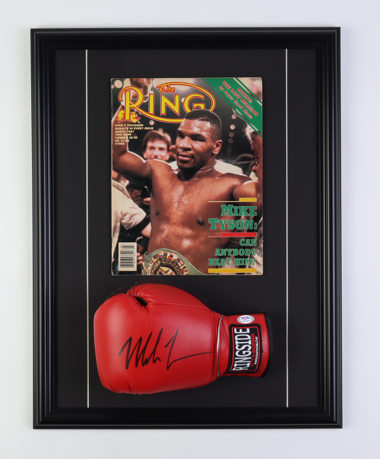 Custom frame measures 17" x 22" and features a Ringside boxing glove that has been hand-signed by Mike Tyson (HOF). Also included in the display is an March 1987 issue "The Ring" magazine.