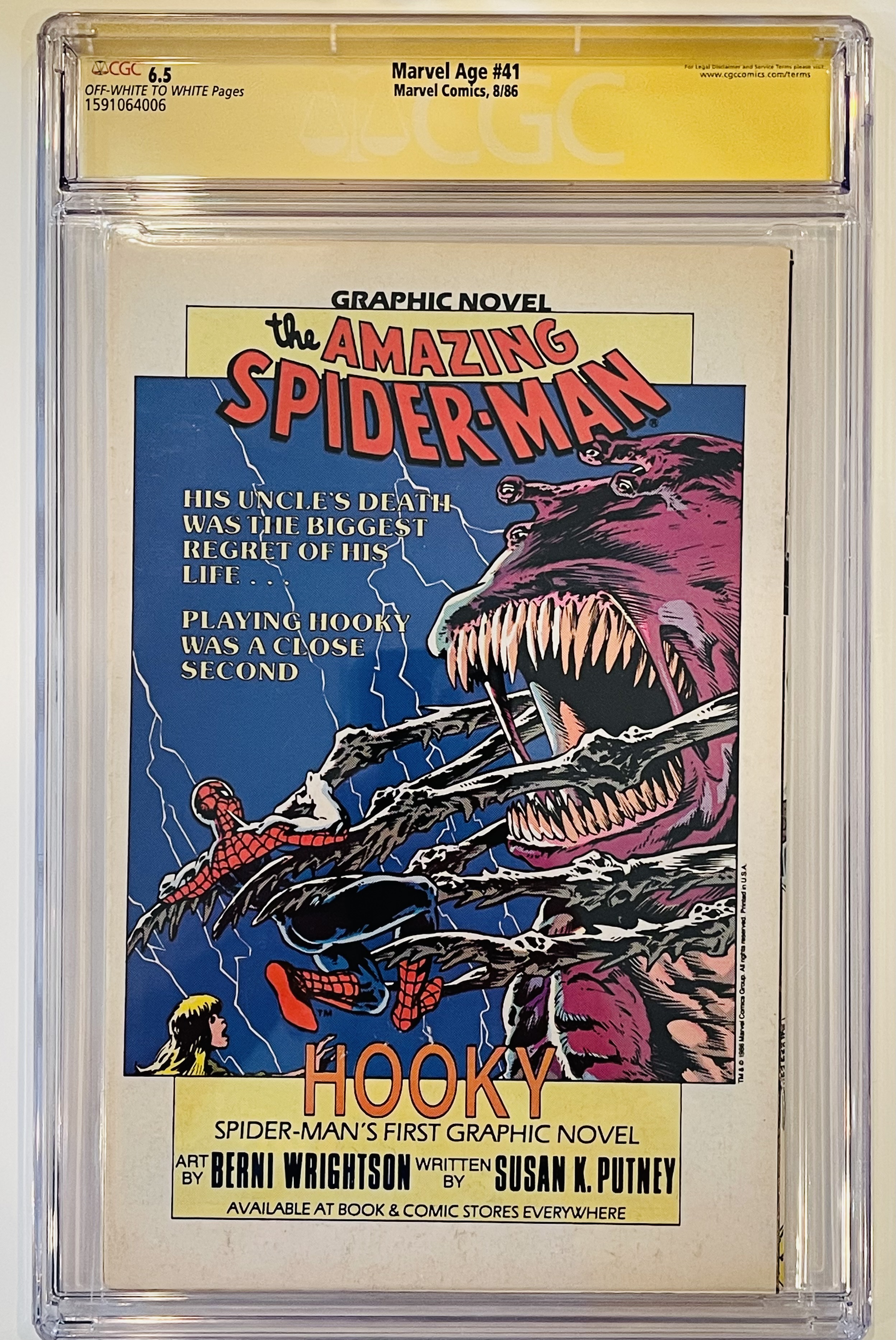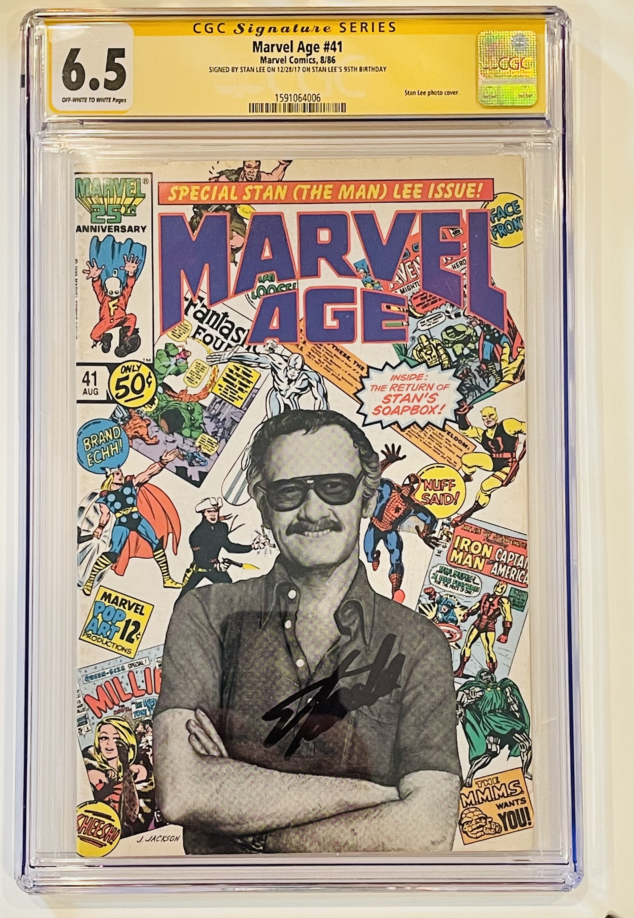 August 1986 "Marvel Age" Issue #41 Marvel Comic Book has been hand-signed by Stan Lee (D. 2018). The comic book has been graded (CGC) 6.5.