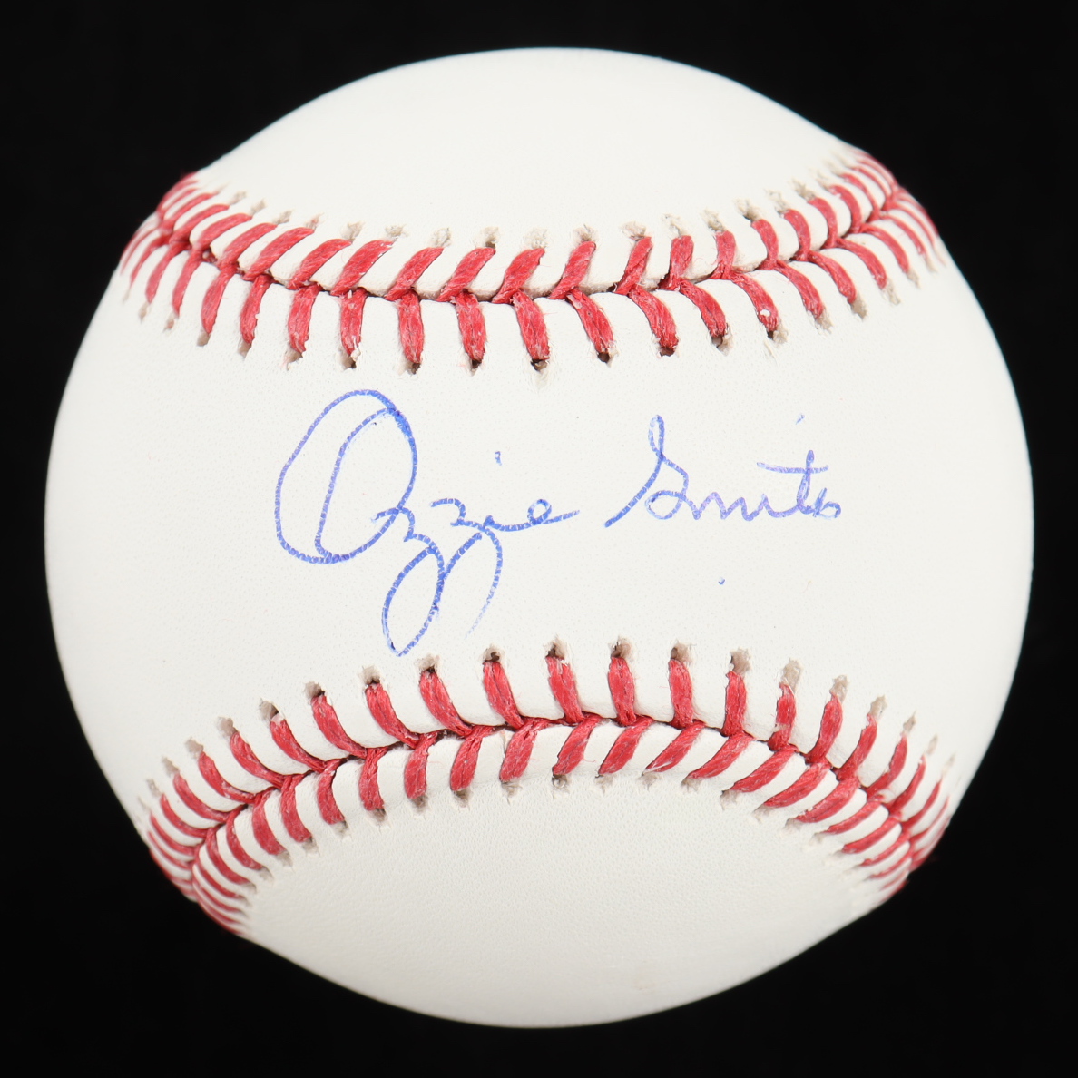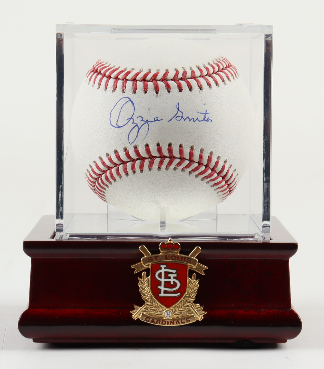 Rawlings Official Major League baseball. Hand-signed by Ozzie Smith (St. Louis Cardinals, HOF). Includes display case with wooden base and pin as shown.