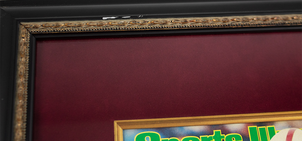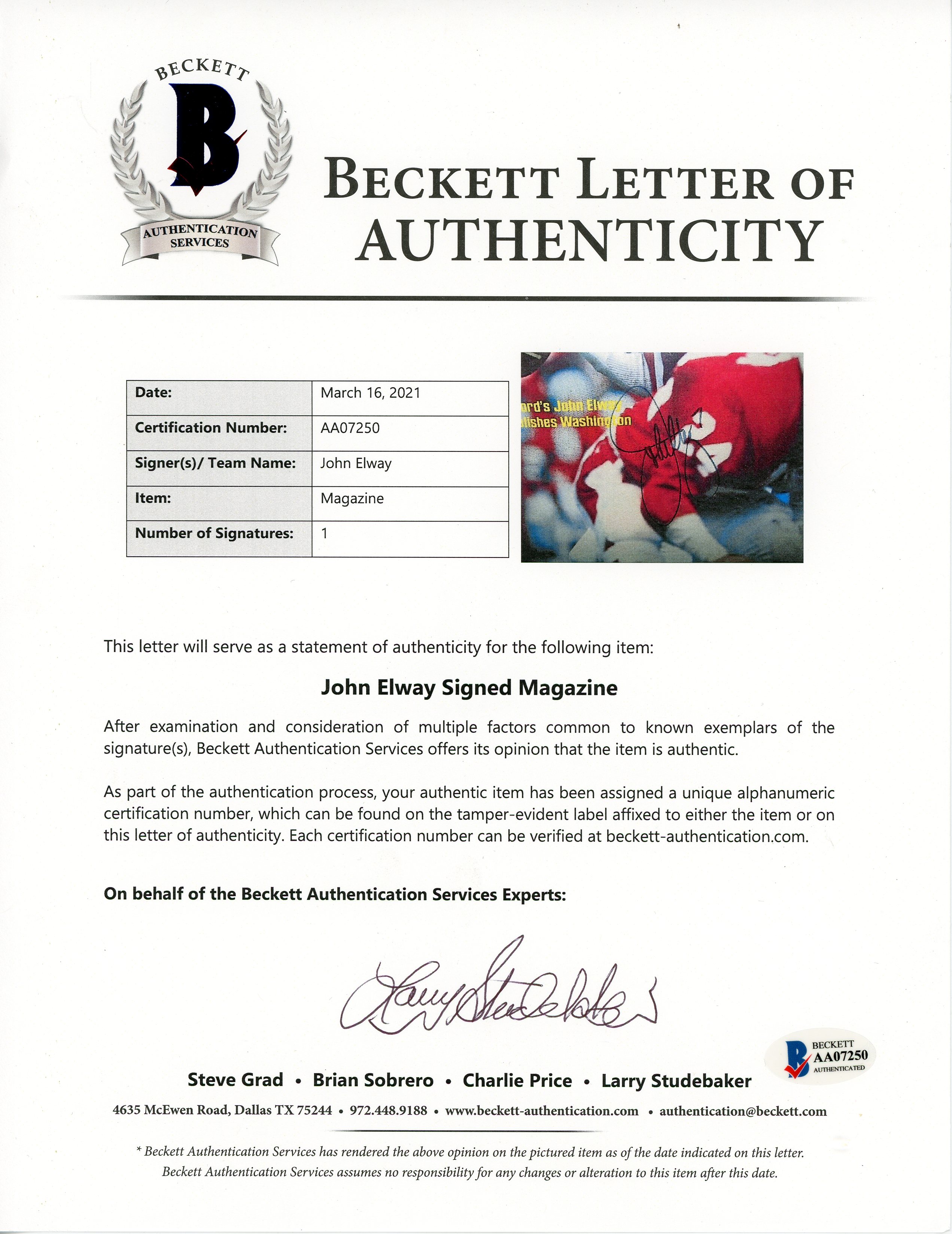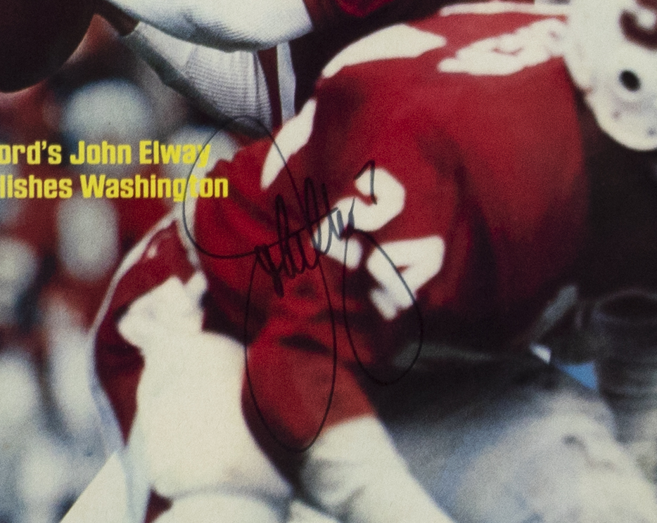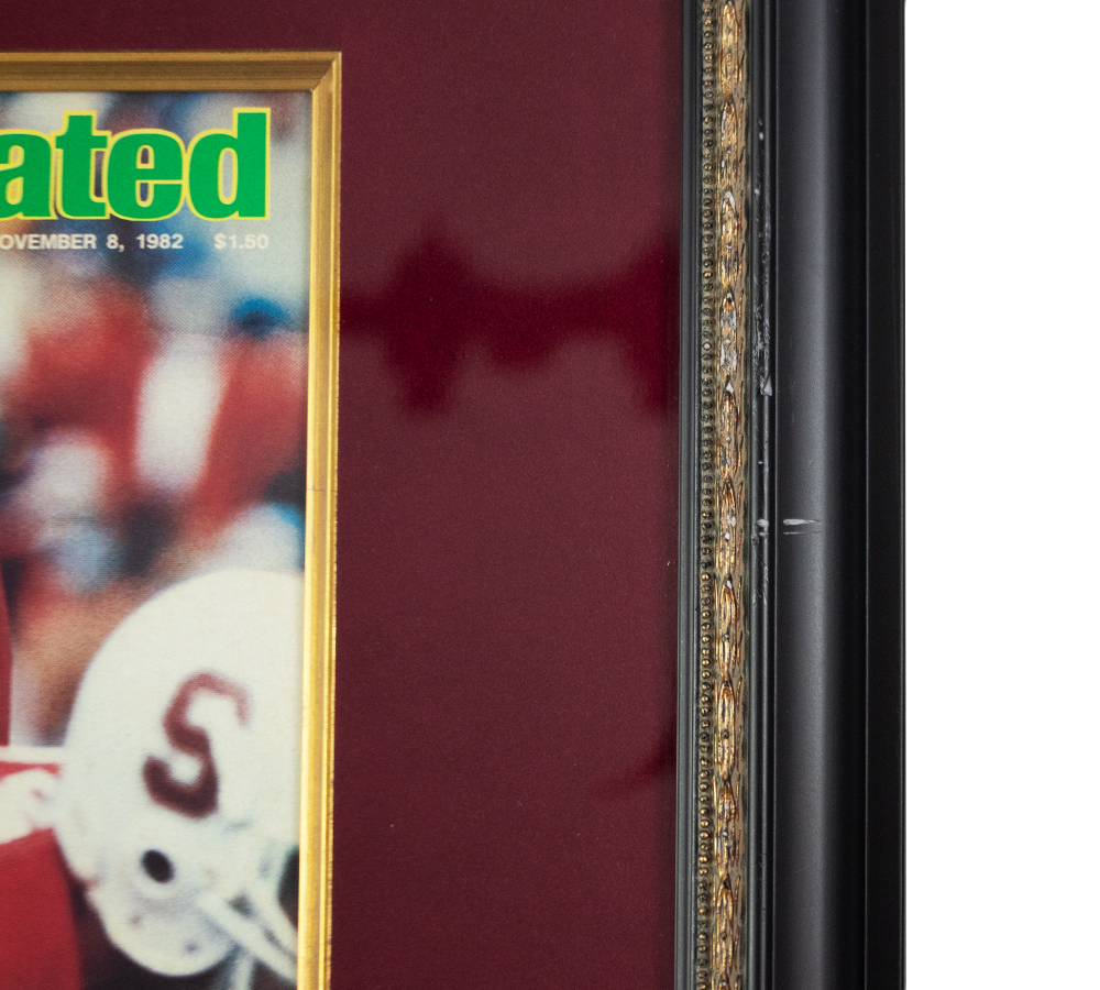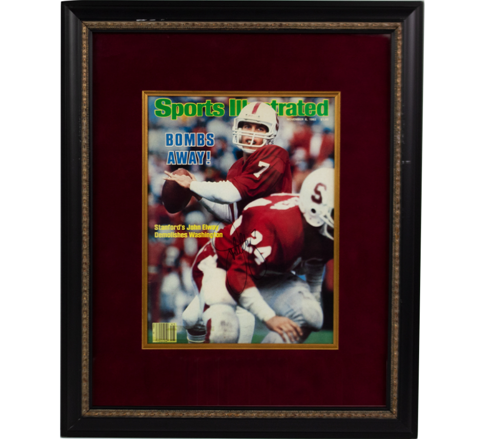 Custom frame measures 15" x 18.5" in size and features a November 8, 1982 issue of Sports Illustrated magazine hand-signed by John Elway (Stanford Cardinal, HOF). Please note, there is some scuffing on the top and right sides of the frame.
