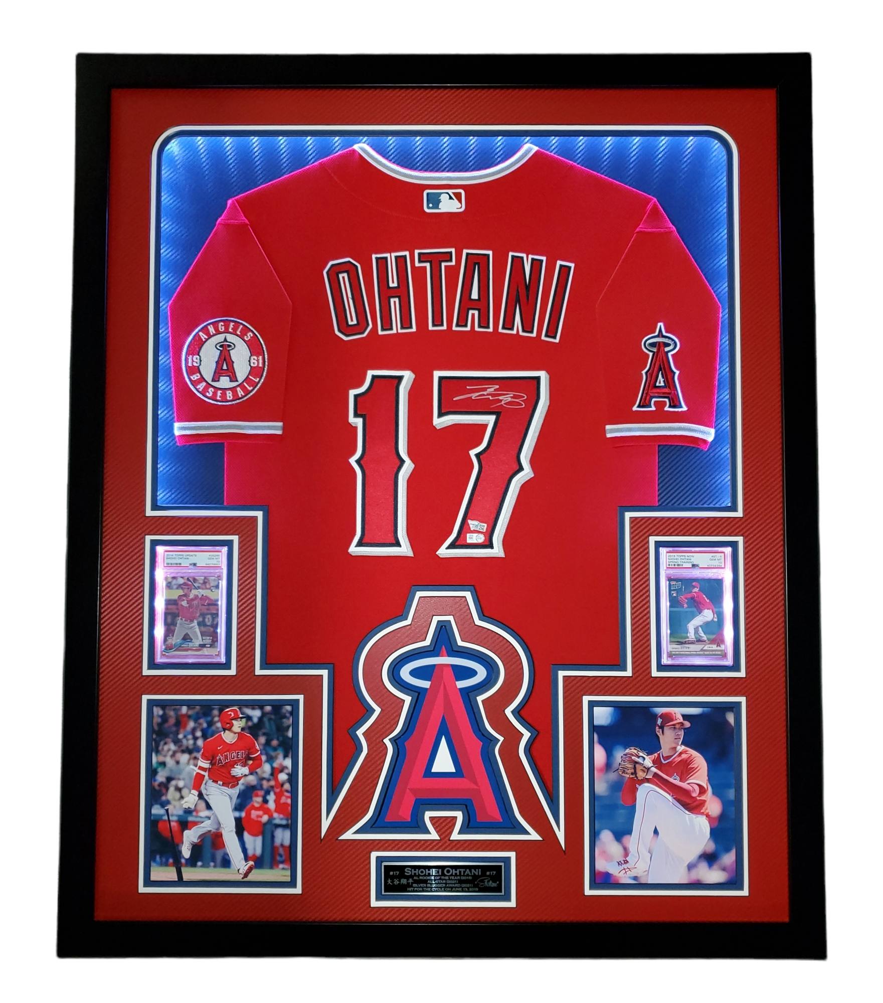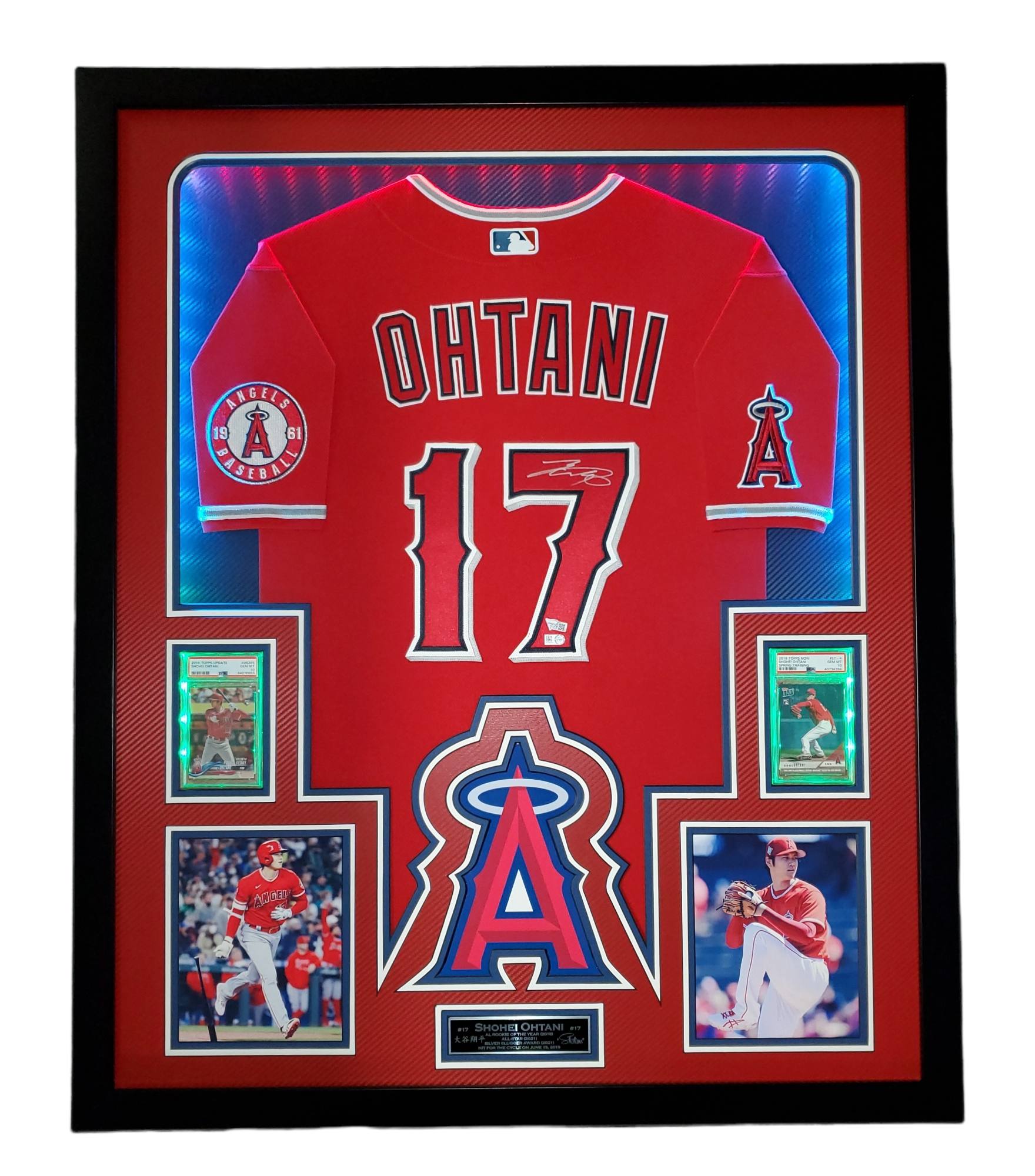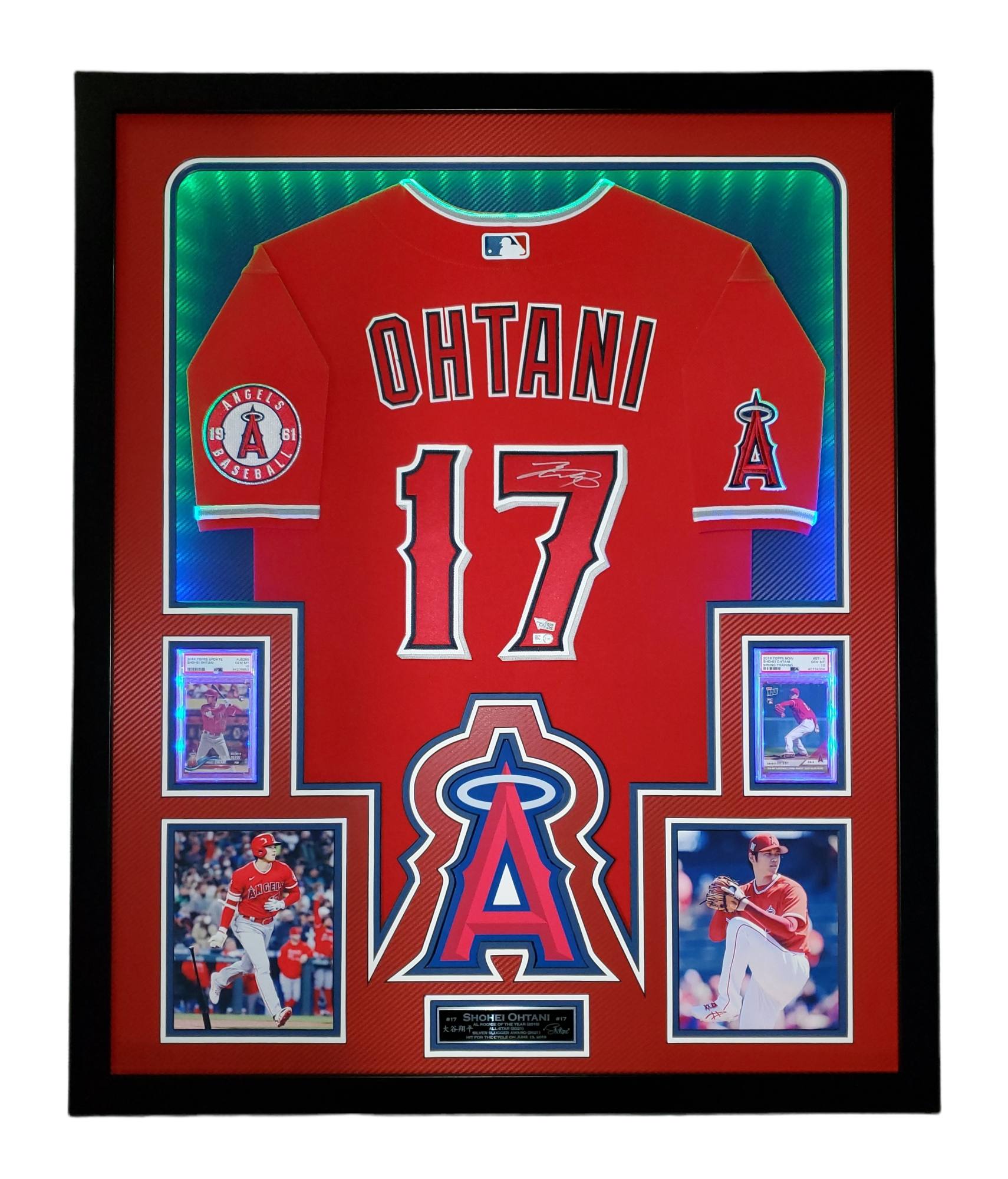 Custom frame measures approximately 34" x 42" in size and features a Nike on-field style jersey that has been hand-signed by Shohei Ohtani (Los Angeles Angels). Display also features a 2018 Topps Update #US285 RD RC (PSA 10), 2018 Topps Now Spring Training #ST4 RC (PSA 10), an engraved nameplate with accomplishments and (2) 6x9 photos all displayed on dual carbon fiber matting with anti-glare UV resistant acrylic. The frame includes advanced USB-powered multi-colored LED lights with battery pack and control. PSA 10 cards are back-lit and can be set to a different color than the other LEDs.