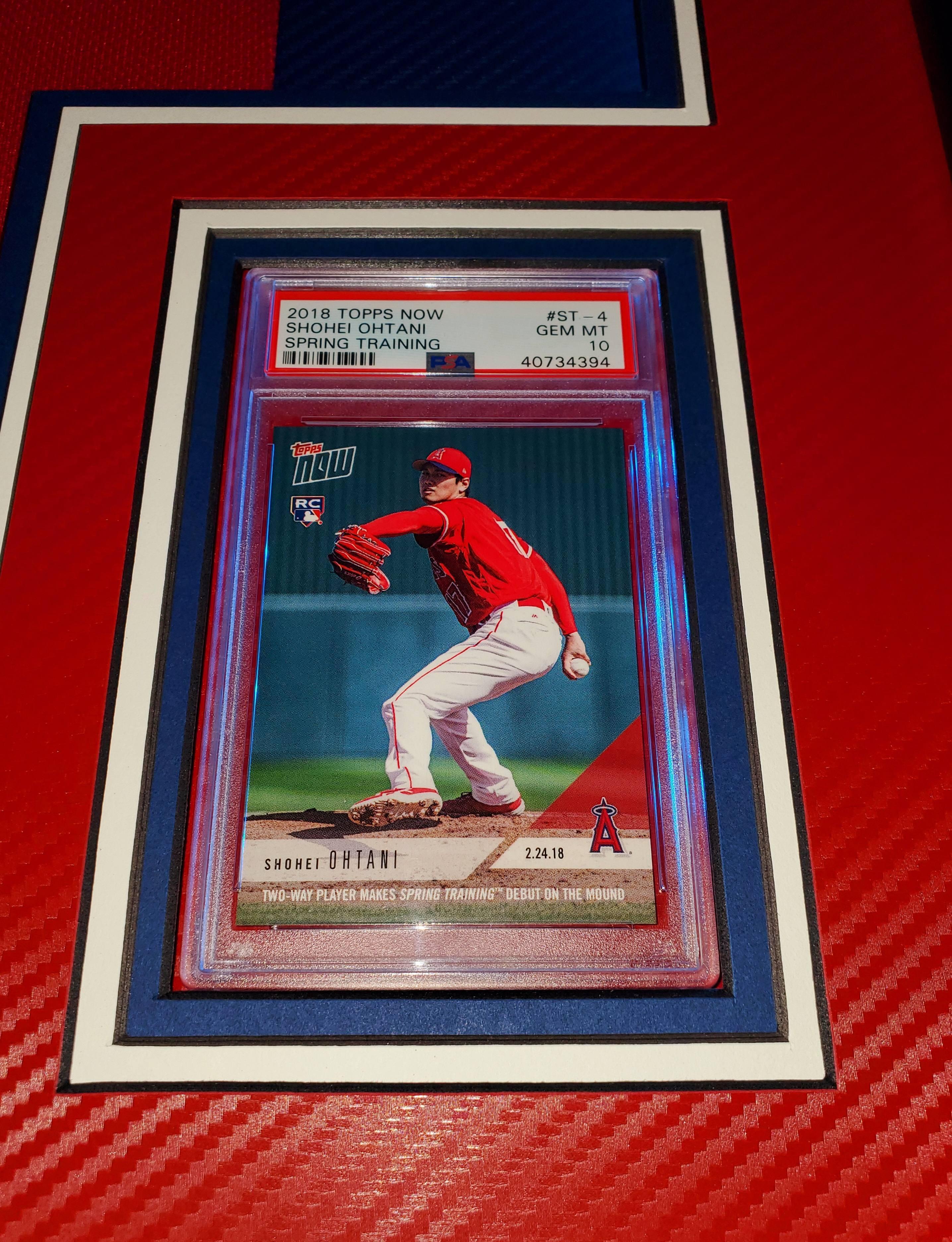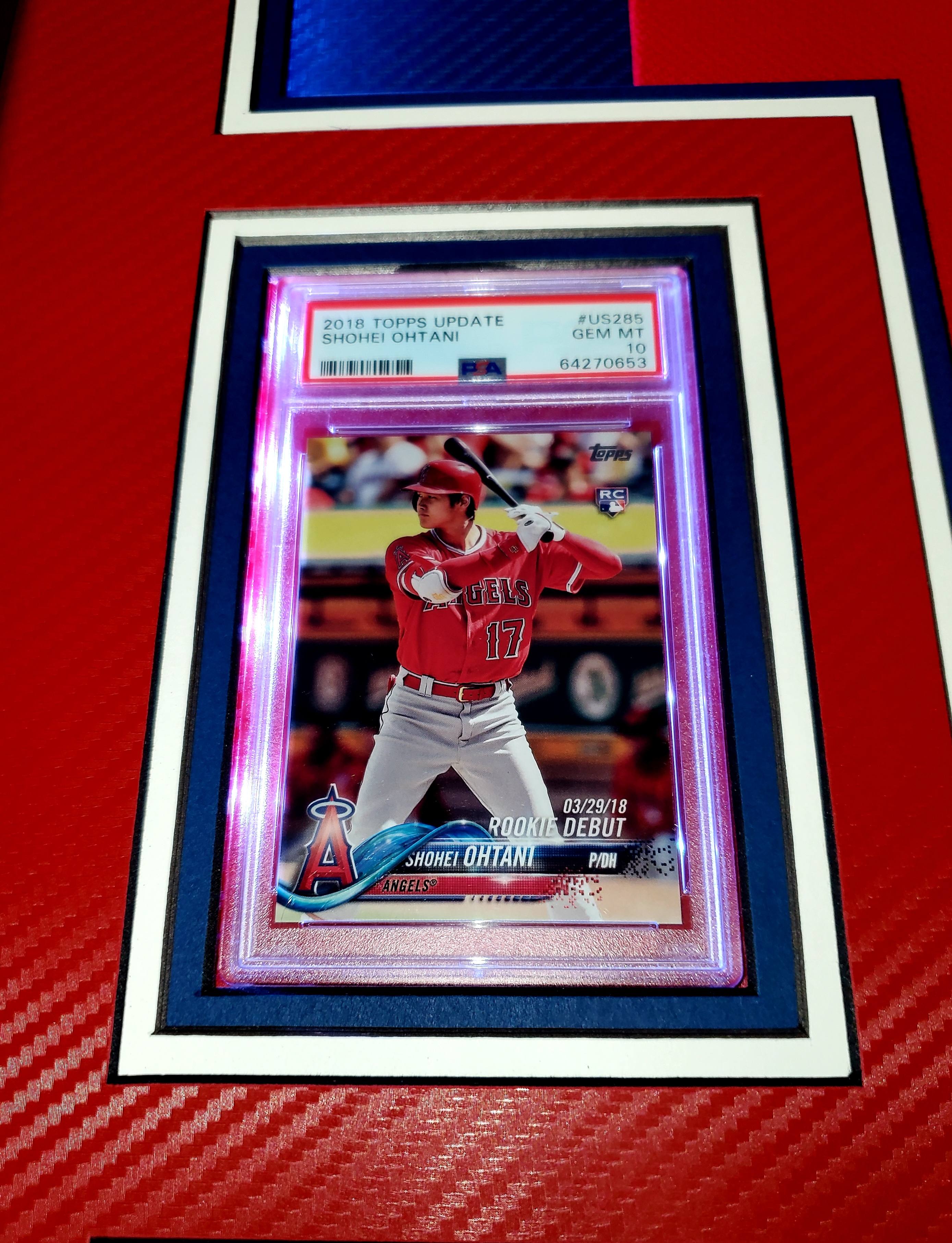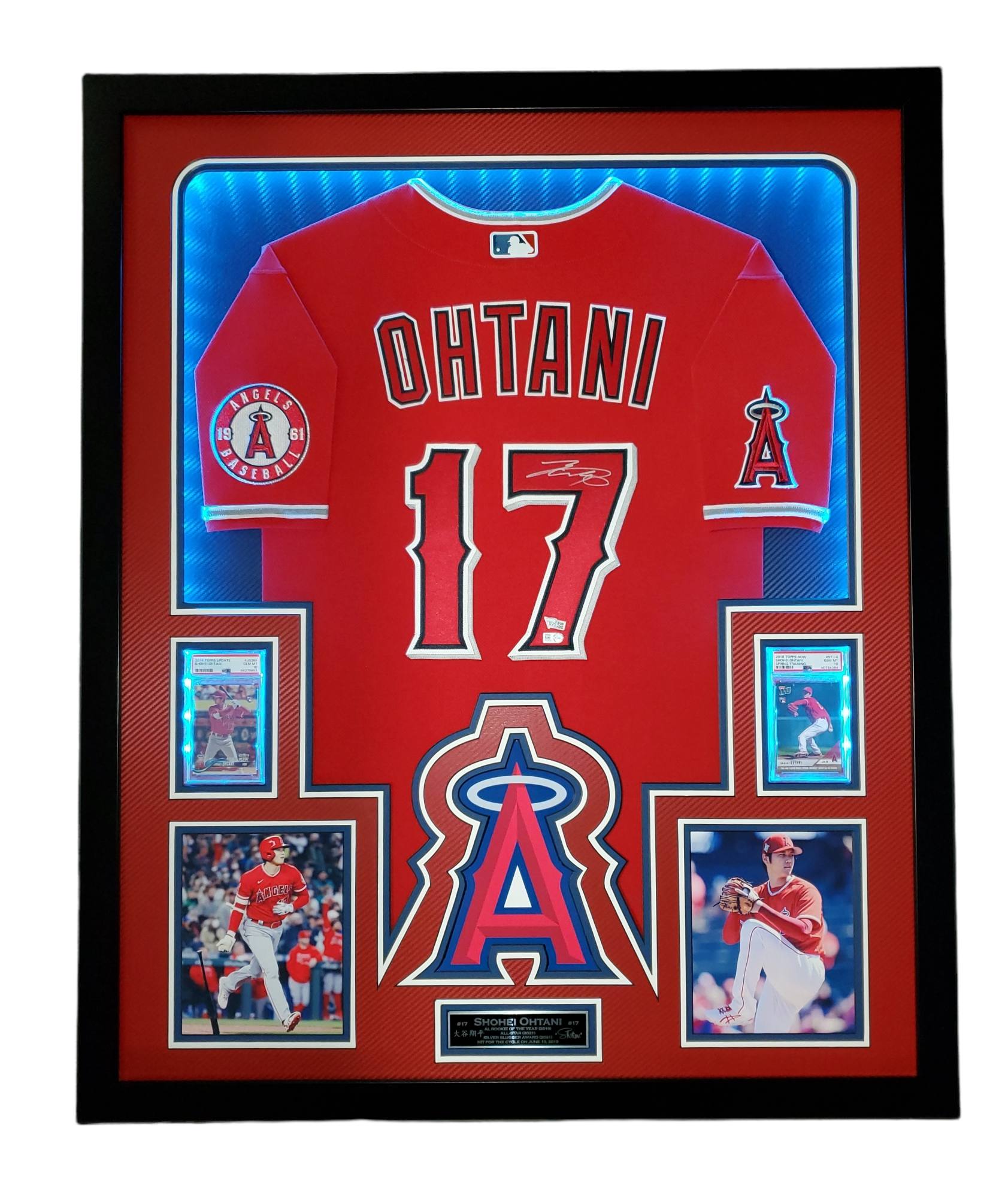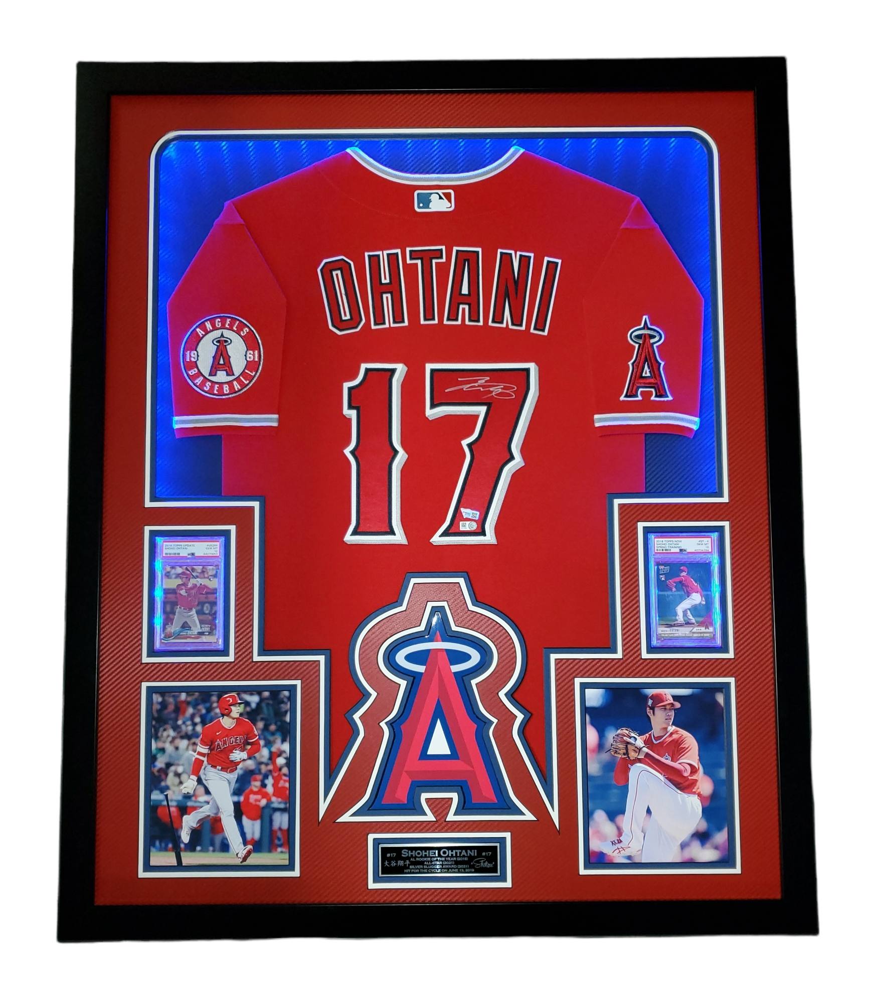 Custom frame measures approximately 34" x 42" in size and features a Nike on-field style jersey that has been hand-signed by Shohei Ohtani (Los Angeles Angels). Display also features a 2018 Topps Update #US285 RD RC (PSA 10), 2018 Topps Now Spring Training #ST4 RC (PSA 10), an engraved nameplate with accomplishments and (2) 6x9 photos all displayed on dual carbon fiber matting with anti-glare UV resistant acrylic. The frame includes advanced USB-powered multi-colored LED lights with battery pack and control. PSA 10 cards are back-lit and can be set to a different color than the other LEDs.