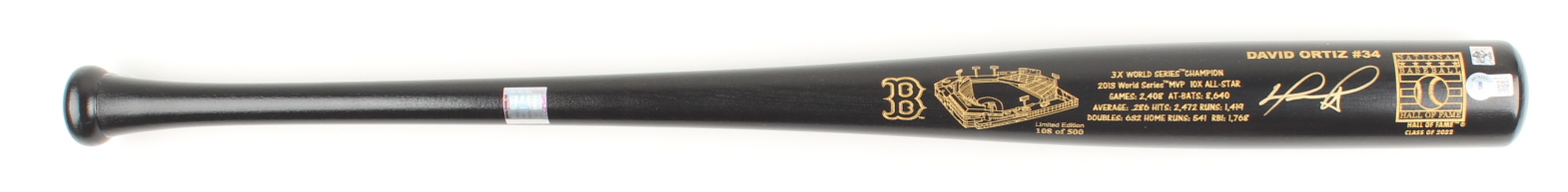 Louisville Slugger player model baseball bat. Hand-signed by David Ortiz (Boston Red Sox, HOF). The baseball bat is numbered limited edition #/500. Please note these are stock images and you will receive a random number from this limited run.