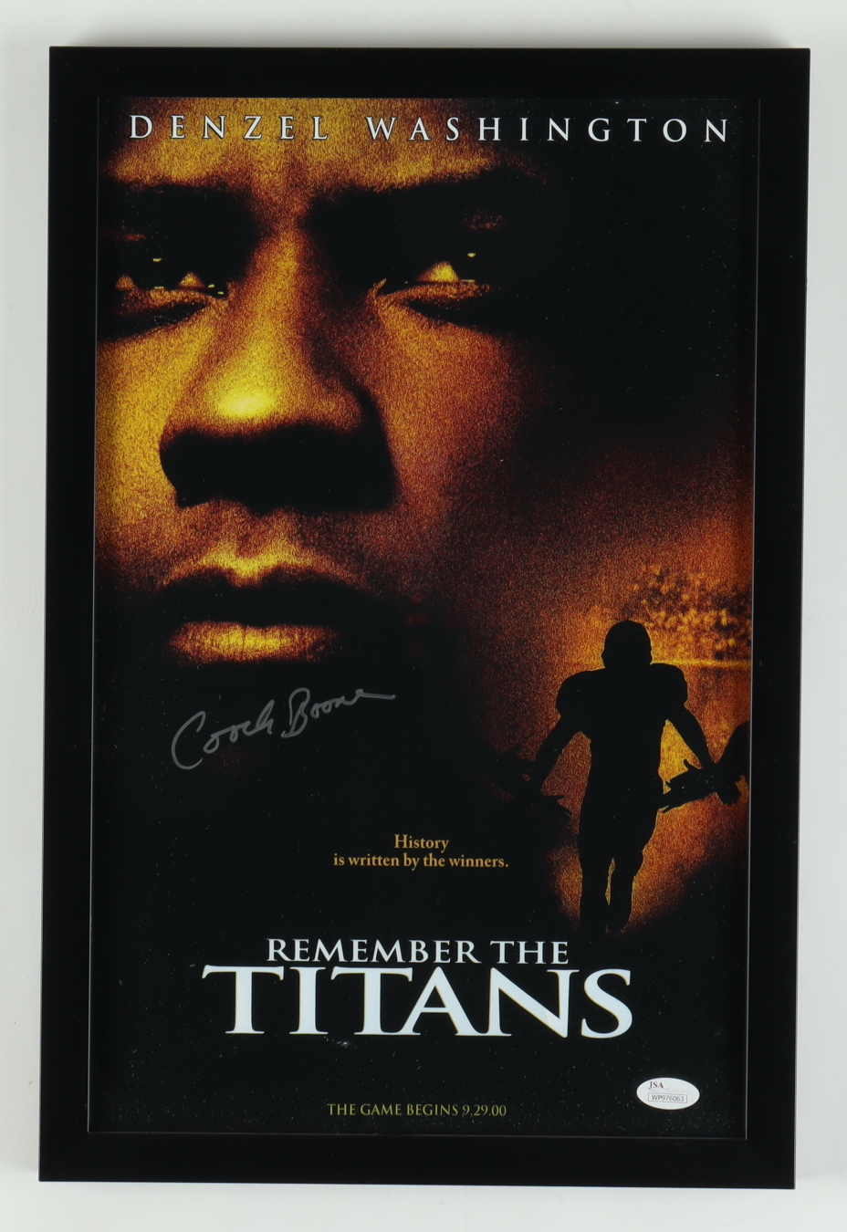 Custom frame measures 12" x 18" in size and features a photo that has been hand-signed by Herman Boone (D.2019). Boone signed the photo as "Coach Boone".
