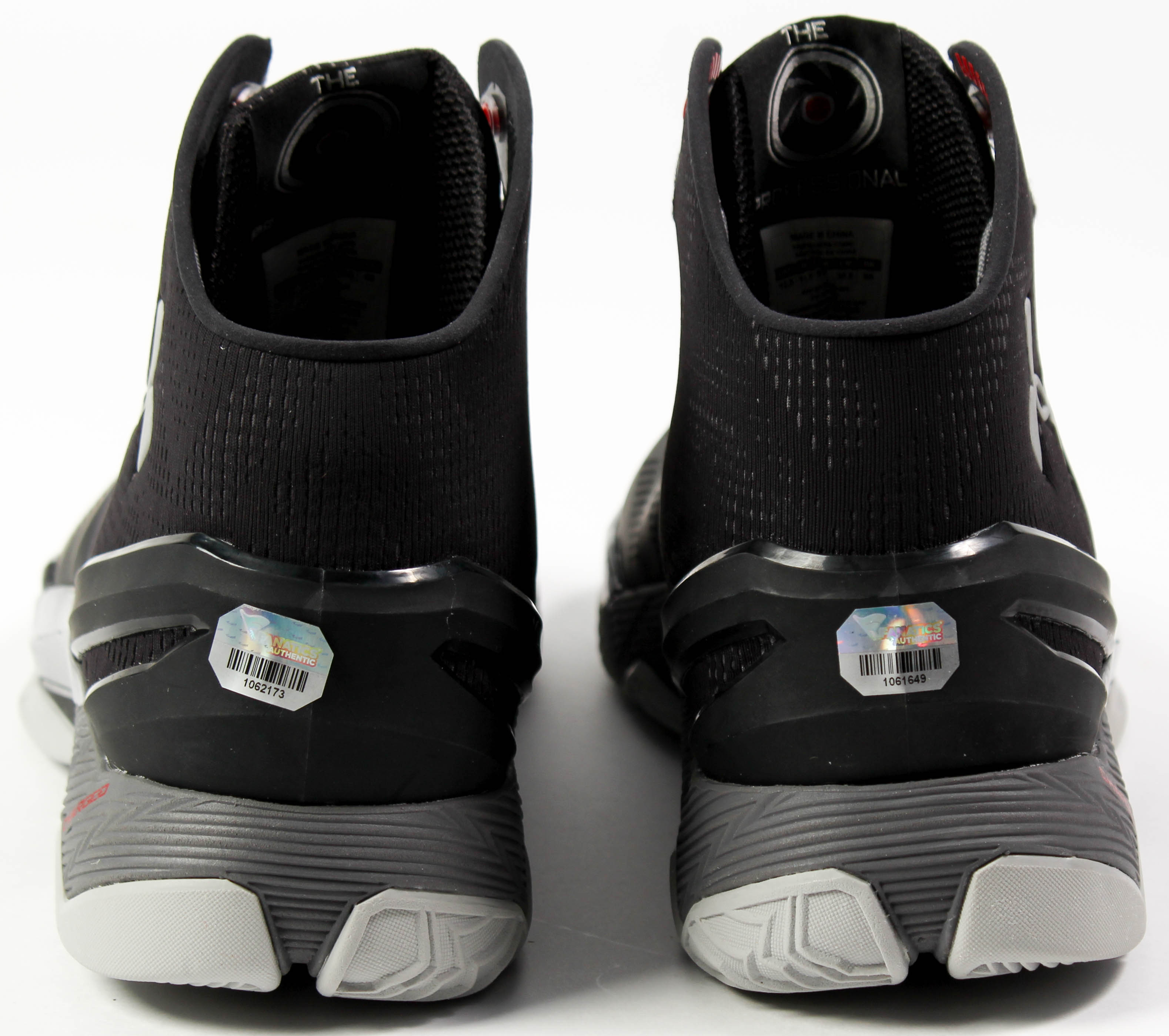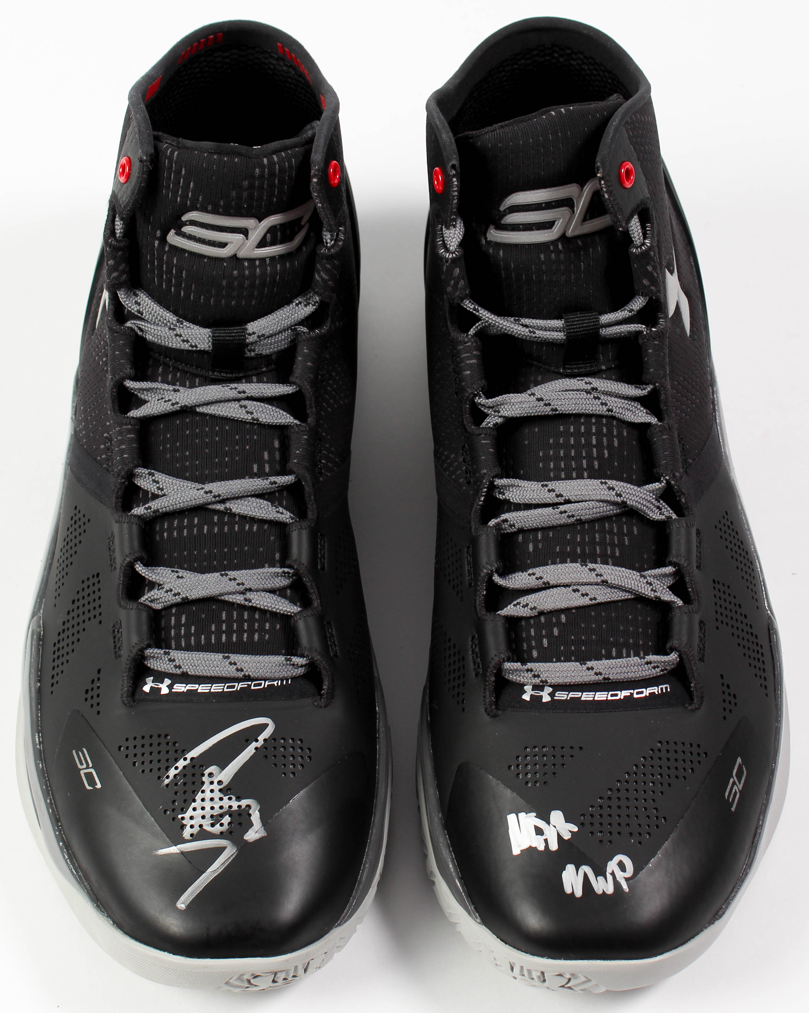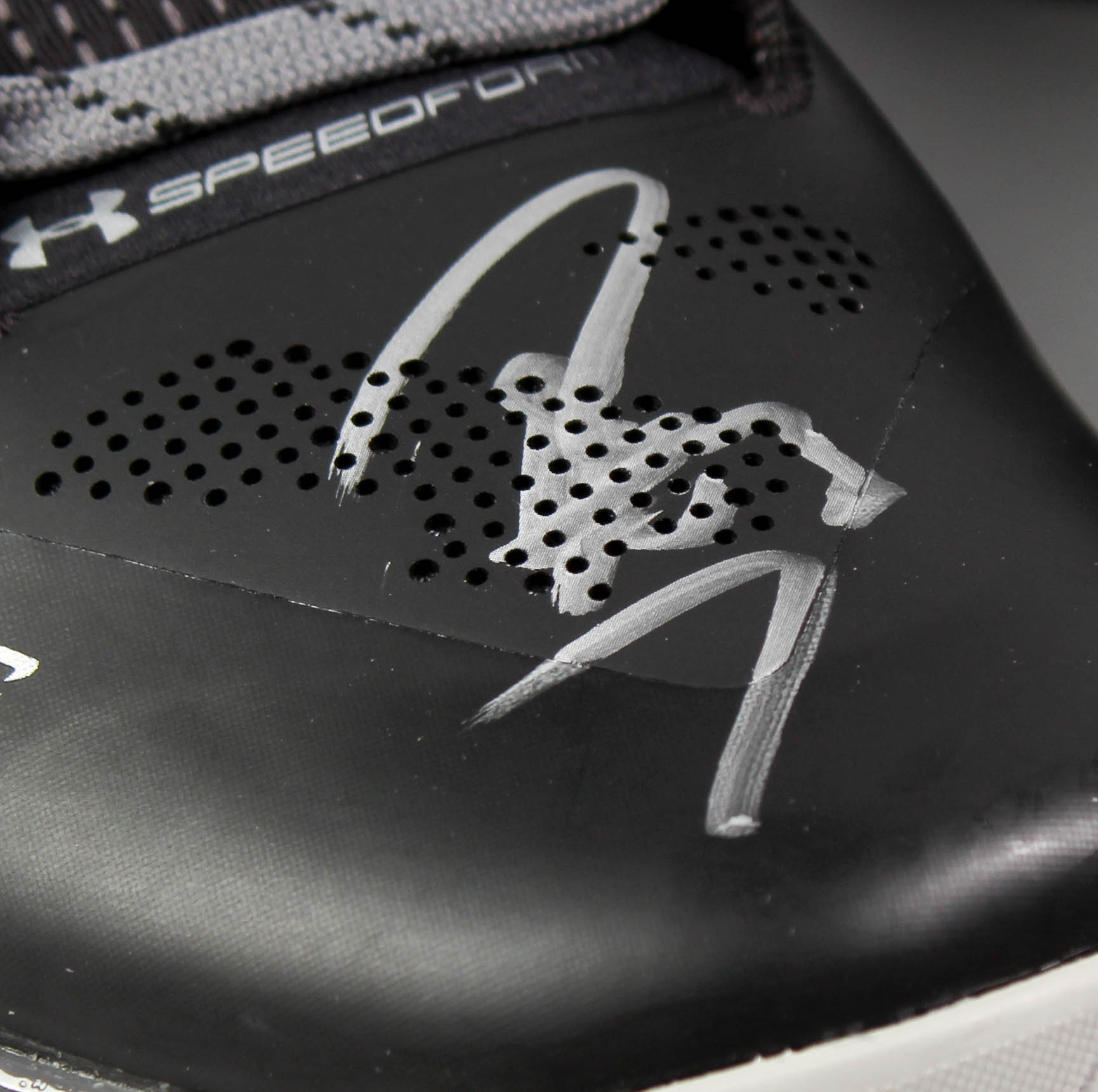 Under Armour Custom "Curry" pair of basketball shoes, size 12.5. Right shoe is hand-signed in silver paint pen by Stephen Curry (Warriors) and the left shoe is inscribed in silver paint.