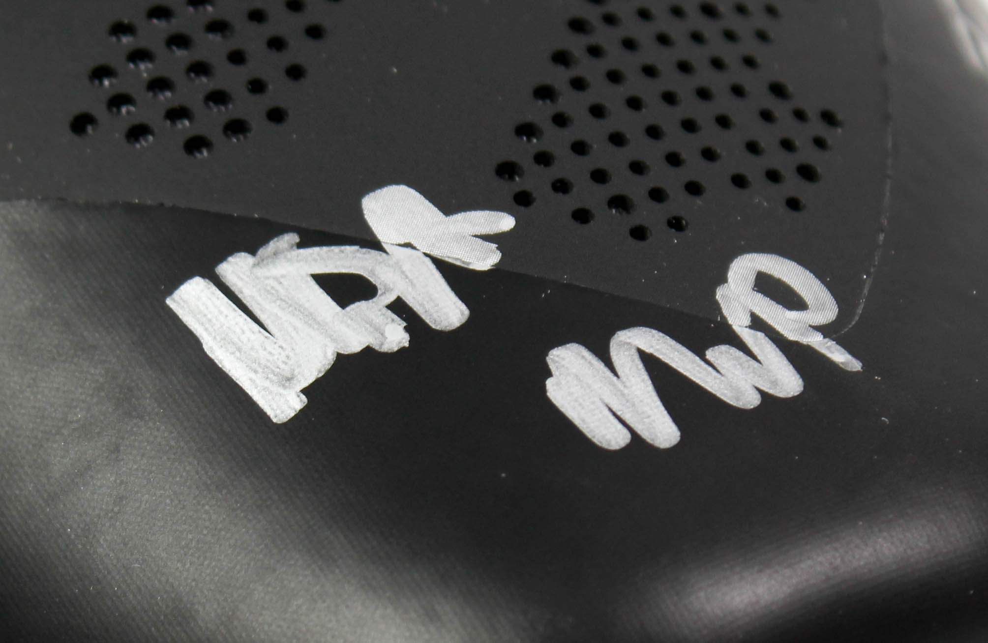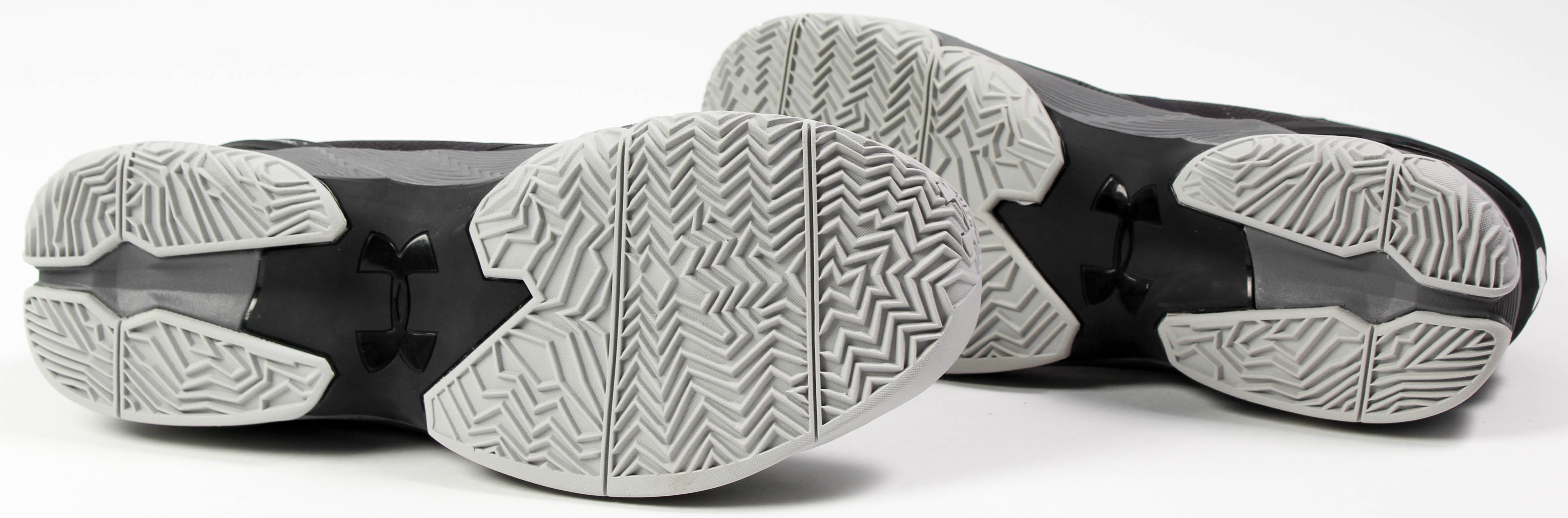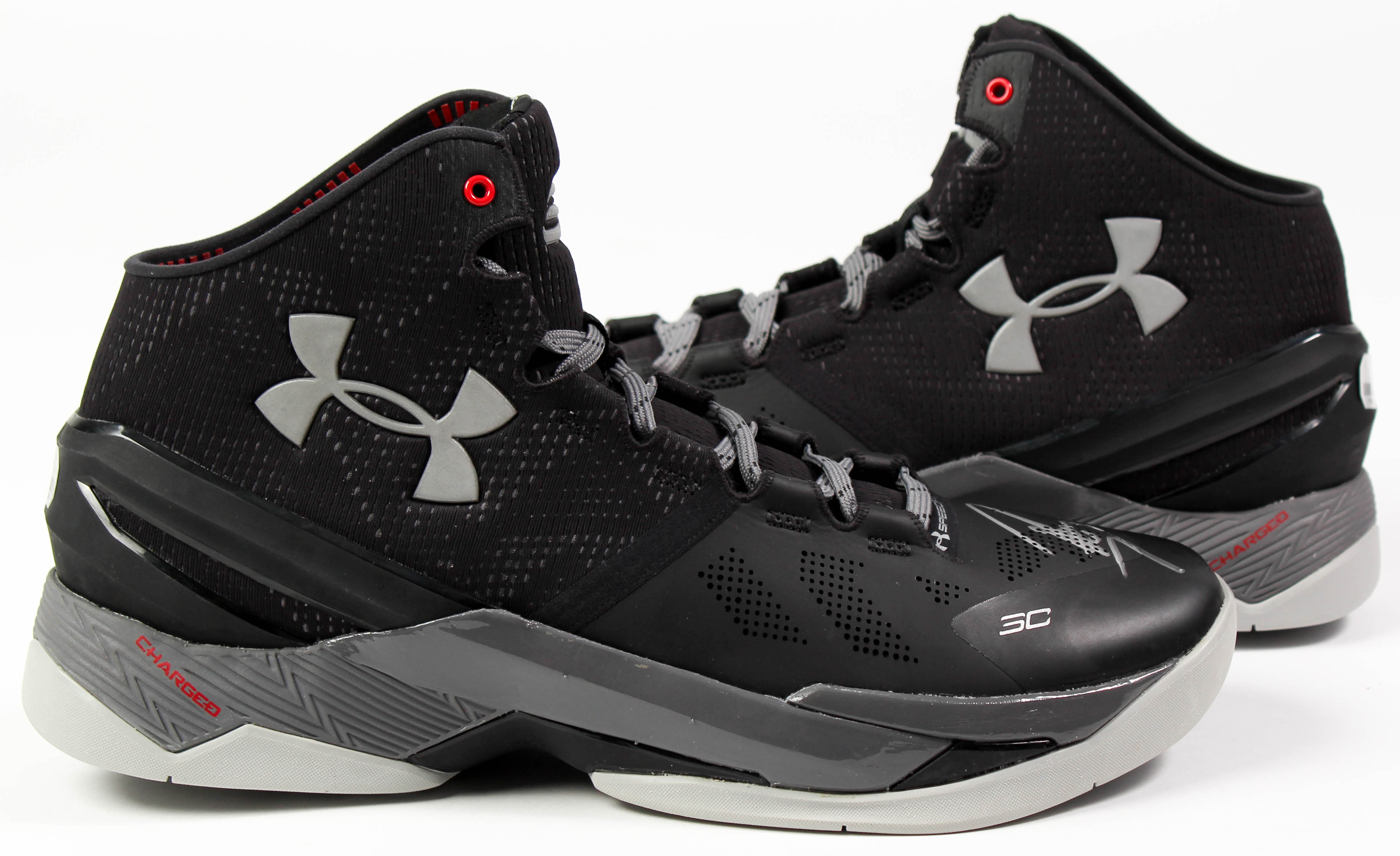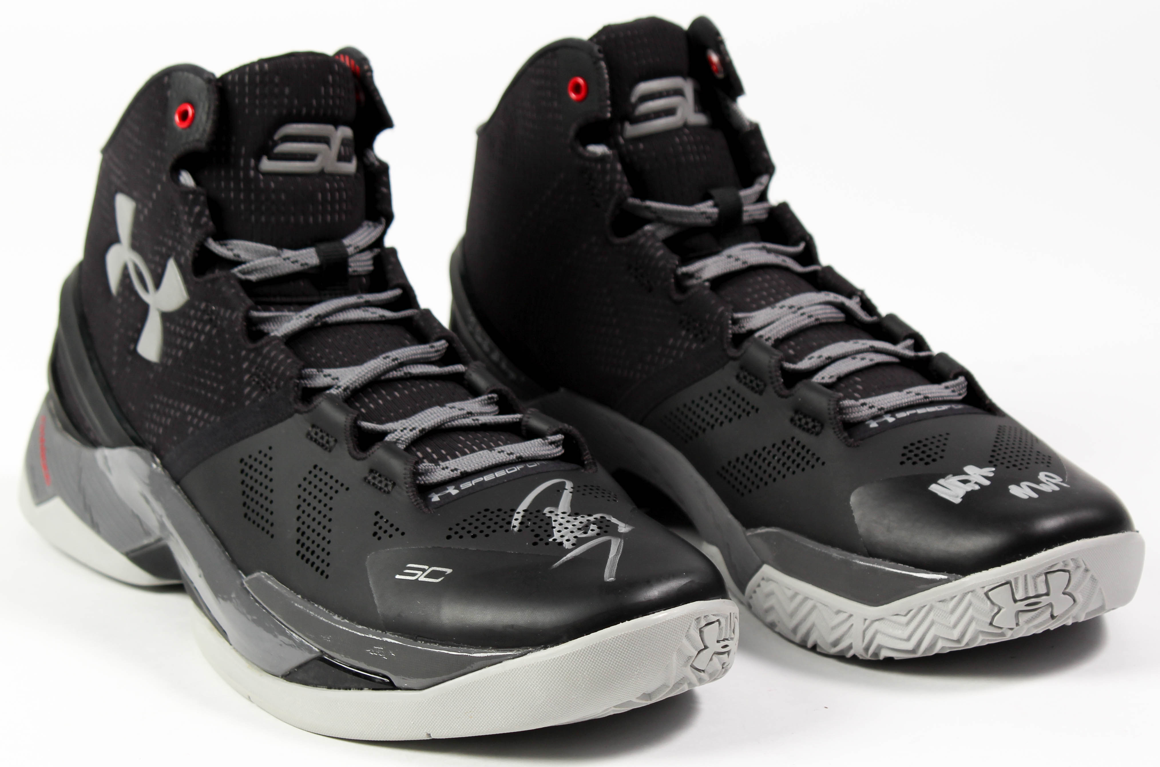 Under Armour Custom "Curry" pair of basketball shoes, size 12.5. Right shoe is hand-signed in silver paint pen by Stephen Curry (Warriors) and the left shoe is inscribed in silver paint.
