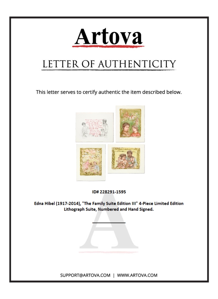 "The Family Suite Edition III" is a 4-piece set of limited edition lithographs on paper celebrating the beauty of family in all of its four stages: "Sowing - The Promise", "Ripening - The Fulfillment", "Harvesting - The Future", and "Through the Generations". Each piece is numbered and hand-signed by Edna Hibel (1917-2014). Includes Certificate of Authenticity. Measures approx. 14" x 18" (box); 12" x 16" (each lithograph).