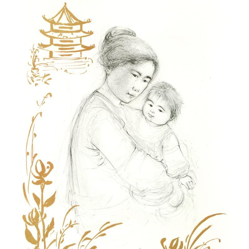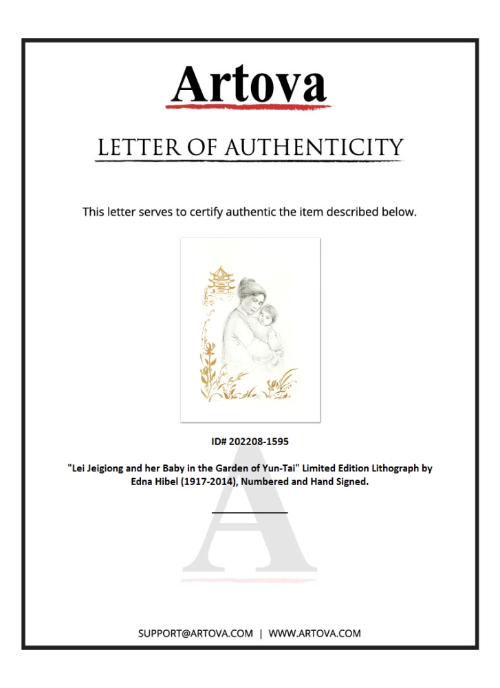 "Lei Jeigiong and her Baby in the Garden of Yun-Tai" is a limited edition lithograph on paper, numbered and hand-signed by Edna Hibel (1917-2014). Includes Certificate of Authenticity! Measures approx. 20" x 26" (with border), 14" x 19" (image).