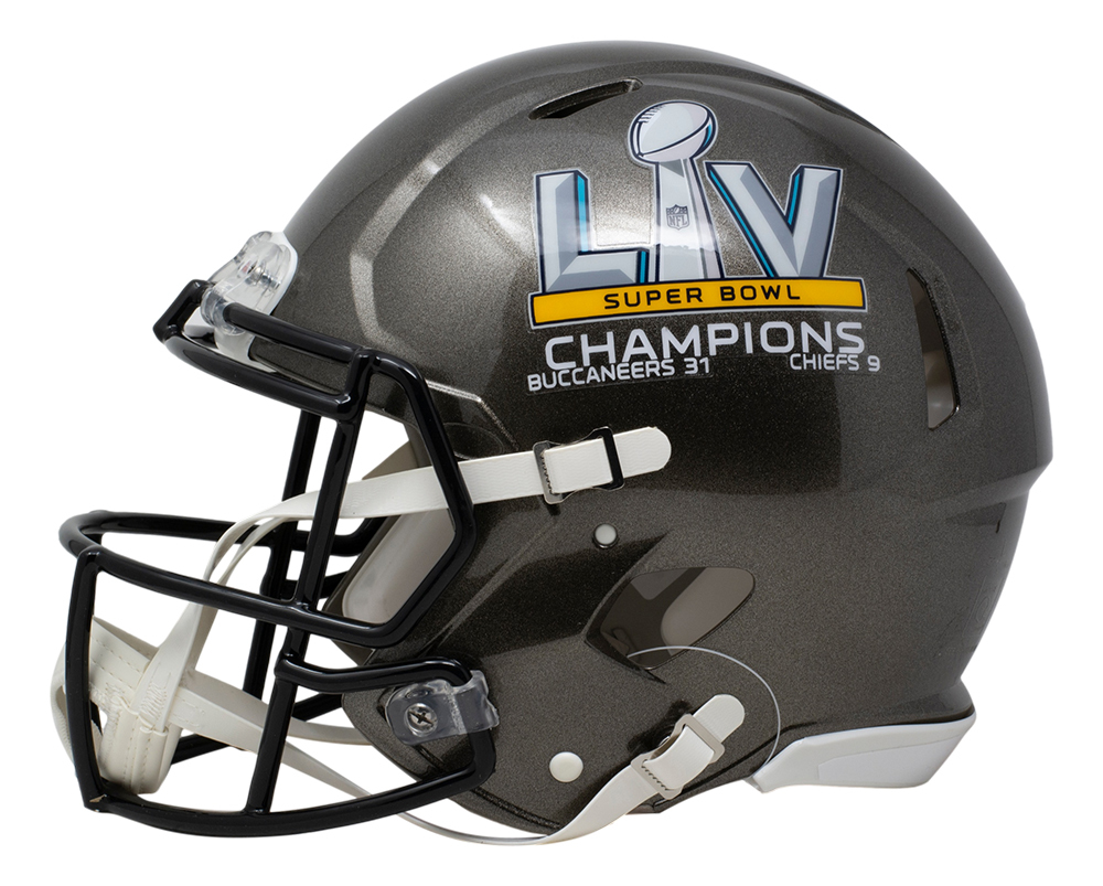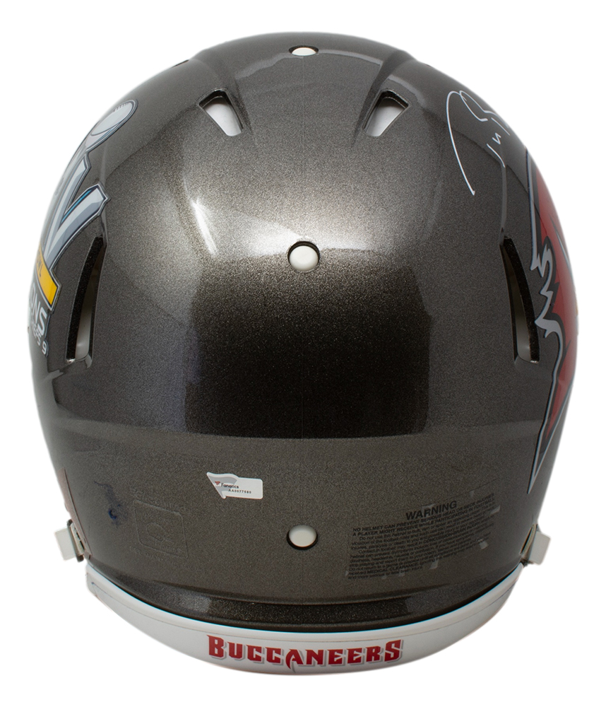 Riddell Tampa Bay Buccaneers Super Bowl LV Champions full-size authentic on-field Speed helmet. Hand-signed by Tom Brady. The display case is included as shown.