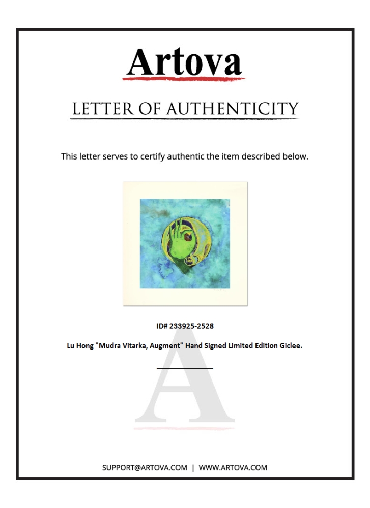 "Mudra Vitarka, Augment" is an limited edition giclee on canvas, by Lu Hong. Hand-signed by the artist, this piece comes with a letter of authenticity. Measures approx. 10" x 10" (image).
