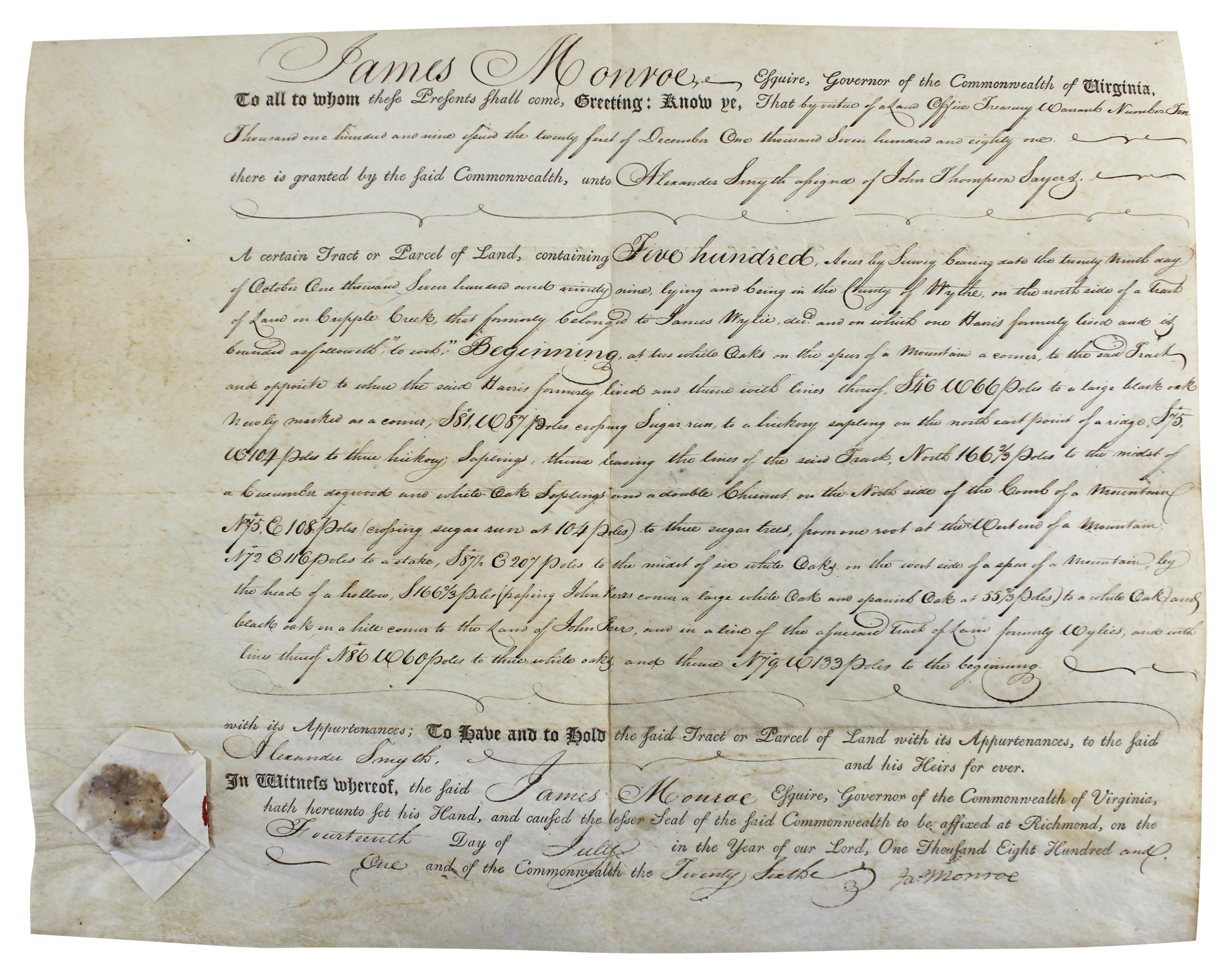 Land grant measures 11.5" x 15" in size and has been hand-signed by James Monroe (D. 1831).